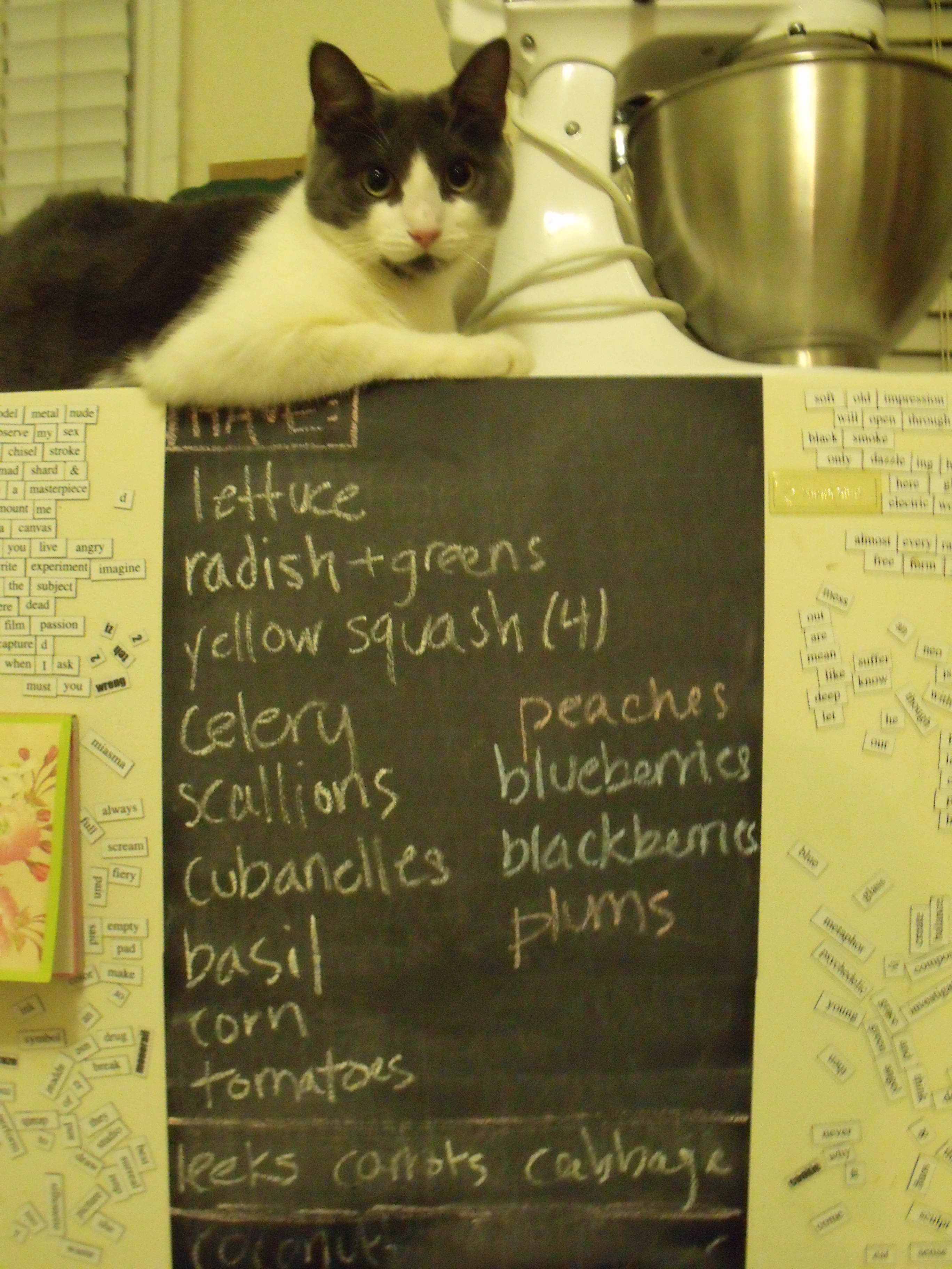 Upon finishing that first meal we cataloged our bounty on the refrigerator chalk board (you can buy these stickers at the MoMa design store, btw. They’re removable and really fun). We find one of the biggest challenges of the share is remembering what we got. So we list it all, and then erase things as we use them. This is our second year at the CSA and we have definitely improved our SPLR (spoiled produce loss rate).