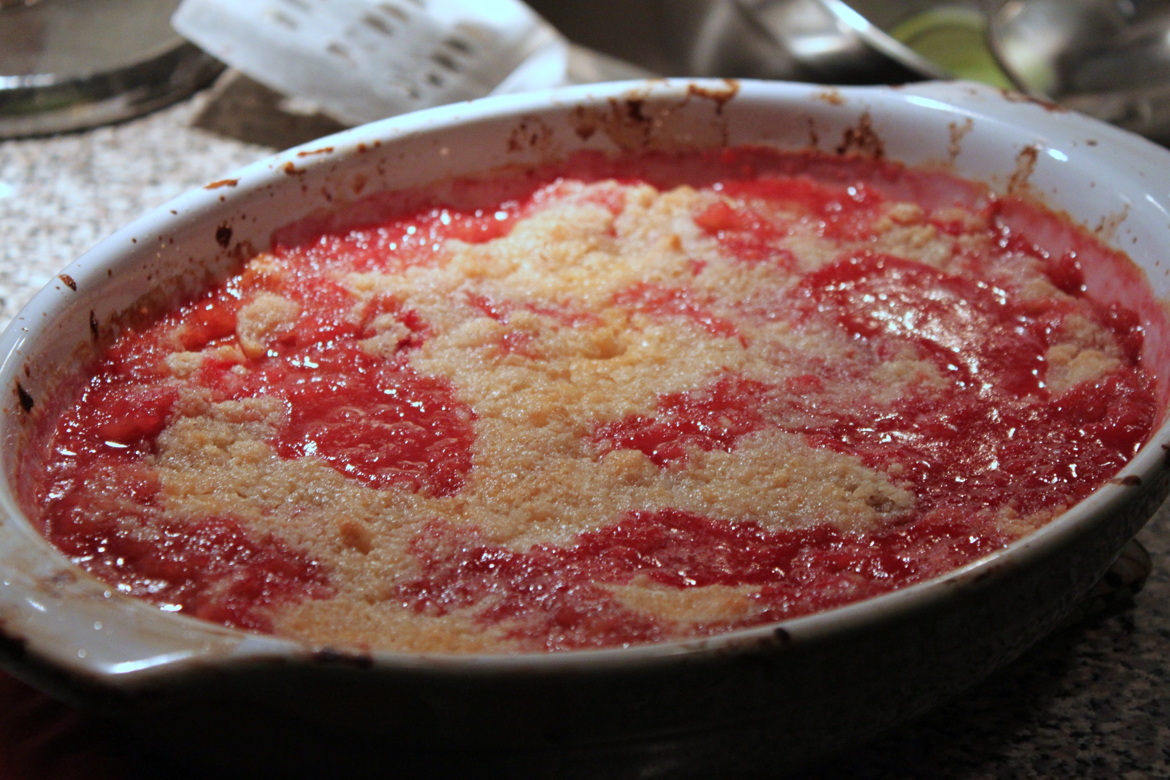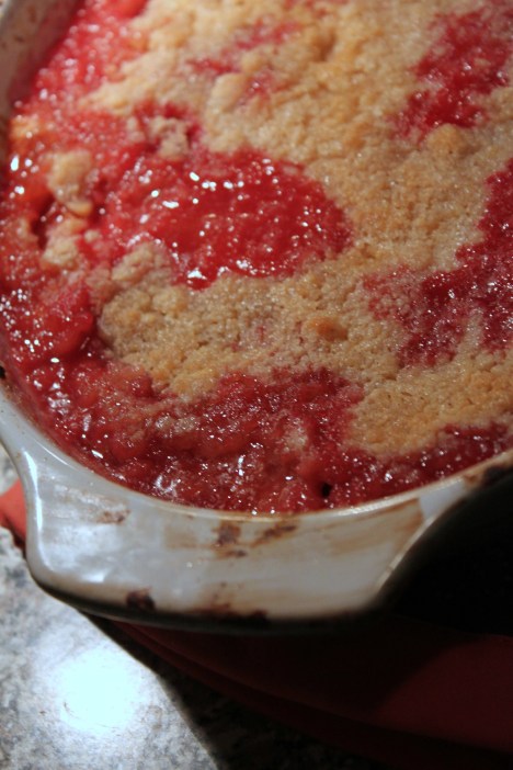 1 stick of butterCombine the first four ingredients and place in a baking dish. Slice the stick of butter and dot the top of the cobbler with the slices. Bake at 350 degrees for 45 minutes. If you prefer a less runny cobbler, bake for an additional 10 to 15 minutes. Serve with a scoop of ice cream.