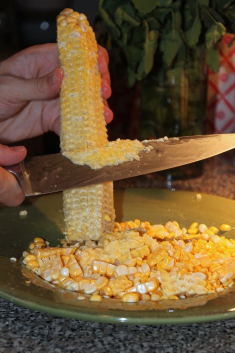 When we picked up the corn, I knew exactly what I wanted to make with it…..creamed corn. Man how I miss my grandmother’s creamed corn. She has a crazy contraption that you grate the corn down that will not only take off the kernels but will also ensure you get all of the necessary milk from the cob. We don’t have said contraption, so we went about it the hard way, with a knife. I would not say this batch was on my grandmother’s level, but it was pretty darn good.