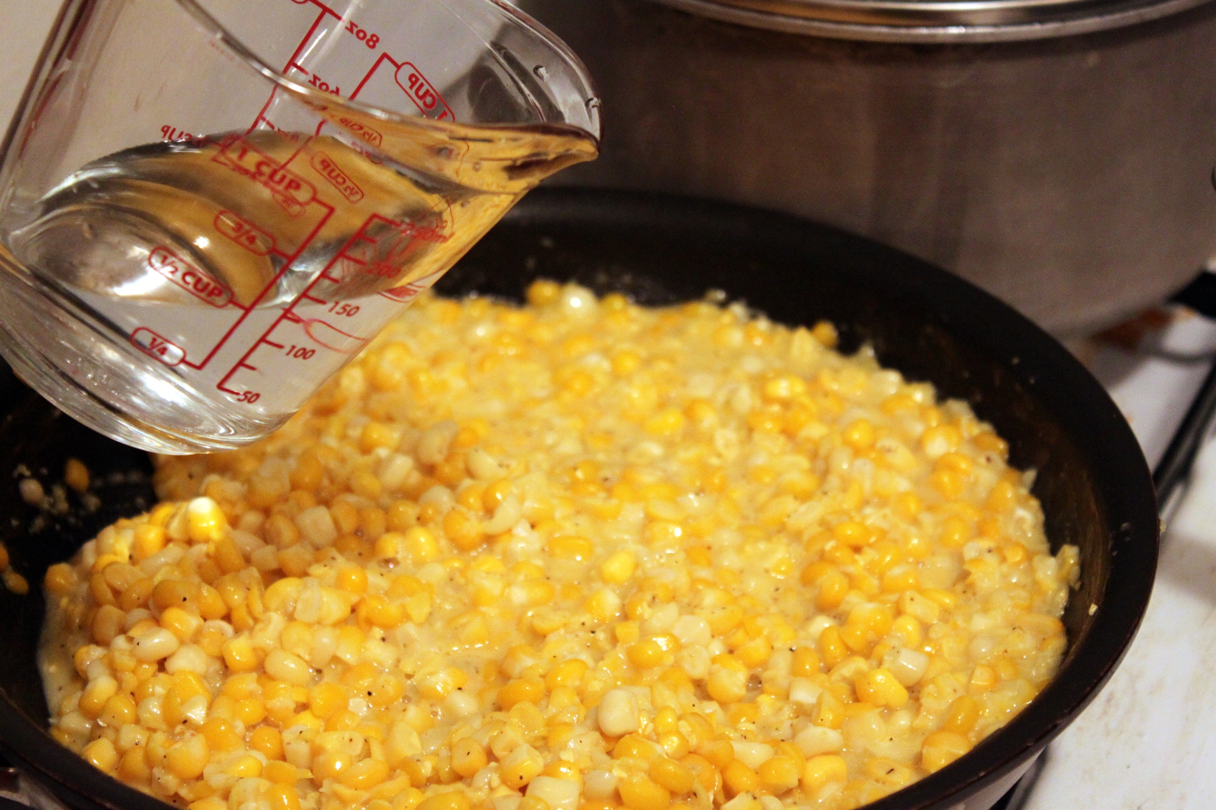 Shuck the corn and ensure all of the silks are removed. Cut the kernels from the cob, but only cut about half of the kernel off. Once you have taken all of the kernels off of the cob, take the back of the knife and run it down each side of the cob. You should see the natural milk from the corn flowing off onto your cutting board and knife. Ensure that you save all of this milk because that is what makes your corn creamy. Once you have done this with four ears of corn, put all of the kernels and cream into a skillet with a half stick of butter and salt and pepper to taste. If the corn is not creamy enough, add water a little bit at the time. The natural starches in the cream will thicken and give you a wonderful Southern side dish.