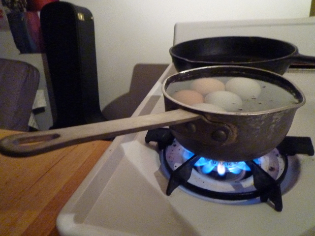 I’d already hard-boiled some of my eggs, so all that was left was boiling the potatoes and some veggie chopping. Easy enough.