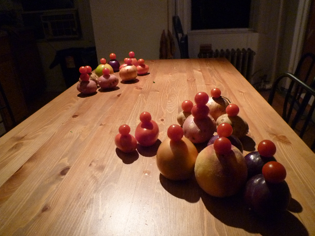 On this blog most people write about how they cooked and consumed their share, which is fantastic, but it’s also worth pointing out the aesthetic and artistic value of each bulbous potato or rosy cherry tomato. My friend came over and with my share sprawled on the kitchen table, our creativity took rein.