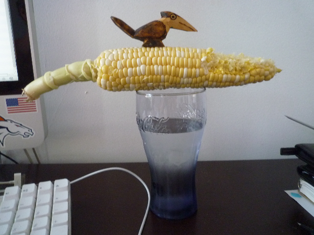 The corn: you know what to do with really fresh, super sweet corn? You eat it. Raw. It doesn’t hurt to boil briefly, but if you don’t have the time and your corn is quality, there’s no need. You eat it. And you can share it with whomever, even a prop bird.