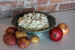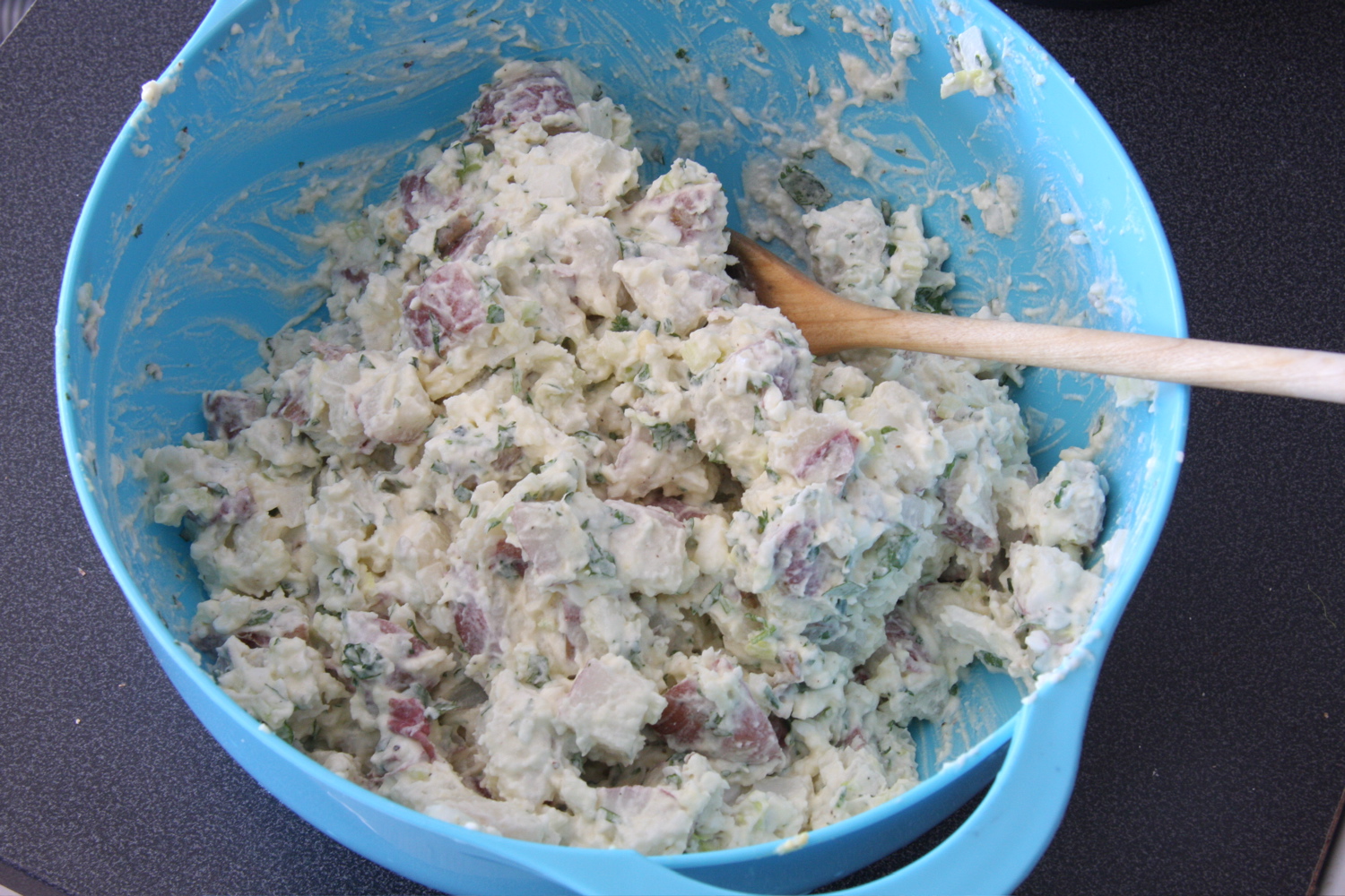 Our latest endeavor was making potato salad together. The recipe has been adapted from a combination of recipes we have tried over the years. The crop share potatoes are buttery and sweet and make a fantastic salad, and the fresh eggs are amazing: