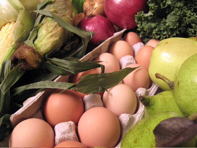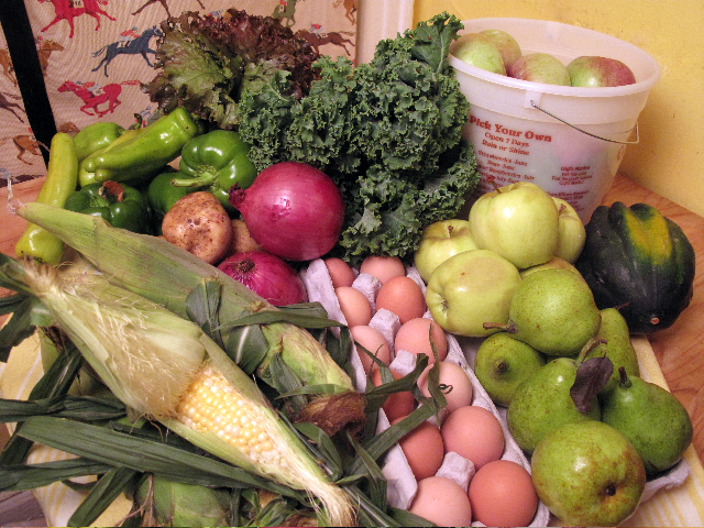 My husband Brett and I (Katie) have a Woods Deluxe Share and we use it to make all of our meals 5-6 days out of the week. In our share this week, we received: 1 bunch kale, 1 head of lettuce, 1 bucket of apples + 4 more apples, 4 pears, 1 acorn squash, 1 dozen eggs, 4 ears of corn, 2 onions, 3 potatoes, 4 green peppers & 4 cubano peppers.Â