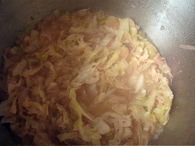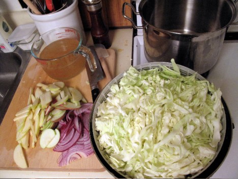 Added cabbage, cider vinegar, water, and a little agave to sweeten and simmered till tender.