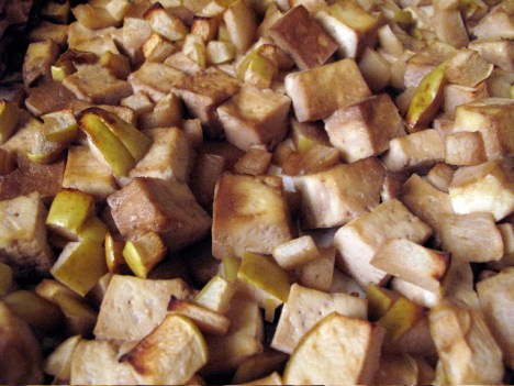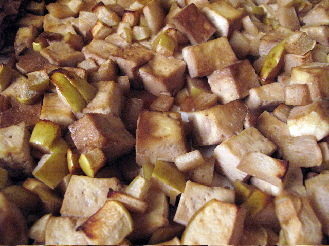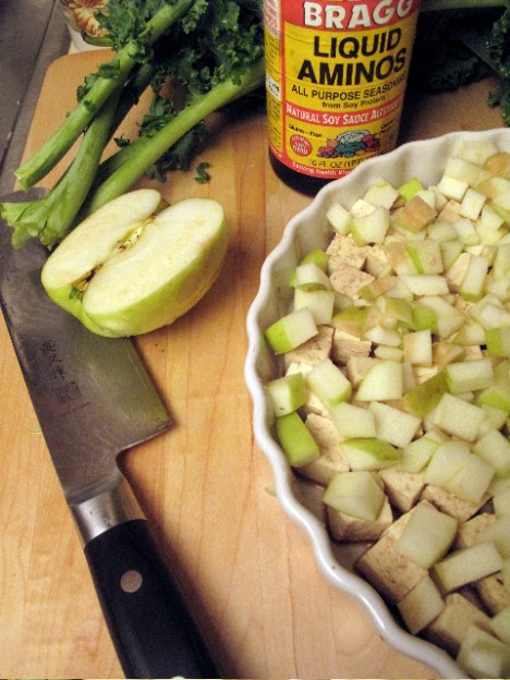 First, I baked some tofu. I love baking tofu with Braggs Liquid Aminos to give the tofu great flavor and texture. I decided to add some apples, since we had so many.