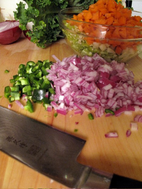 Then I chopped up some of the peppers, onion, more apple, jalepeno (from the week before), and carrot. Check out my awesome veggie cleaver!