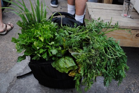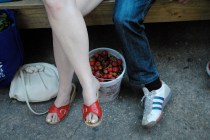 They walk into the backyard at the Woods. They see the buckets of strawberries. They see our bags of local greens. They see us picking up our farm share.