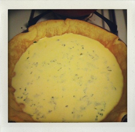 Then I pricked the bottom of the quiche crust with a fork all over as per the recipe and poured 1/2 of the liquid mixture in. I baked this for about 7 mins at 425 degrees so it could set.