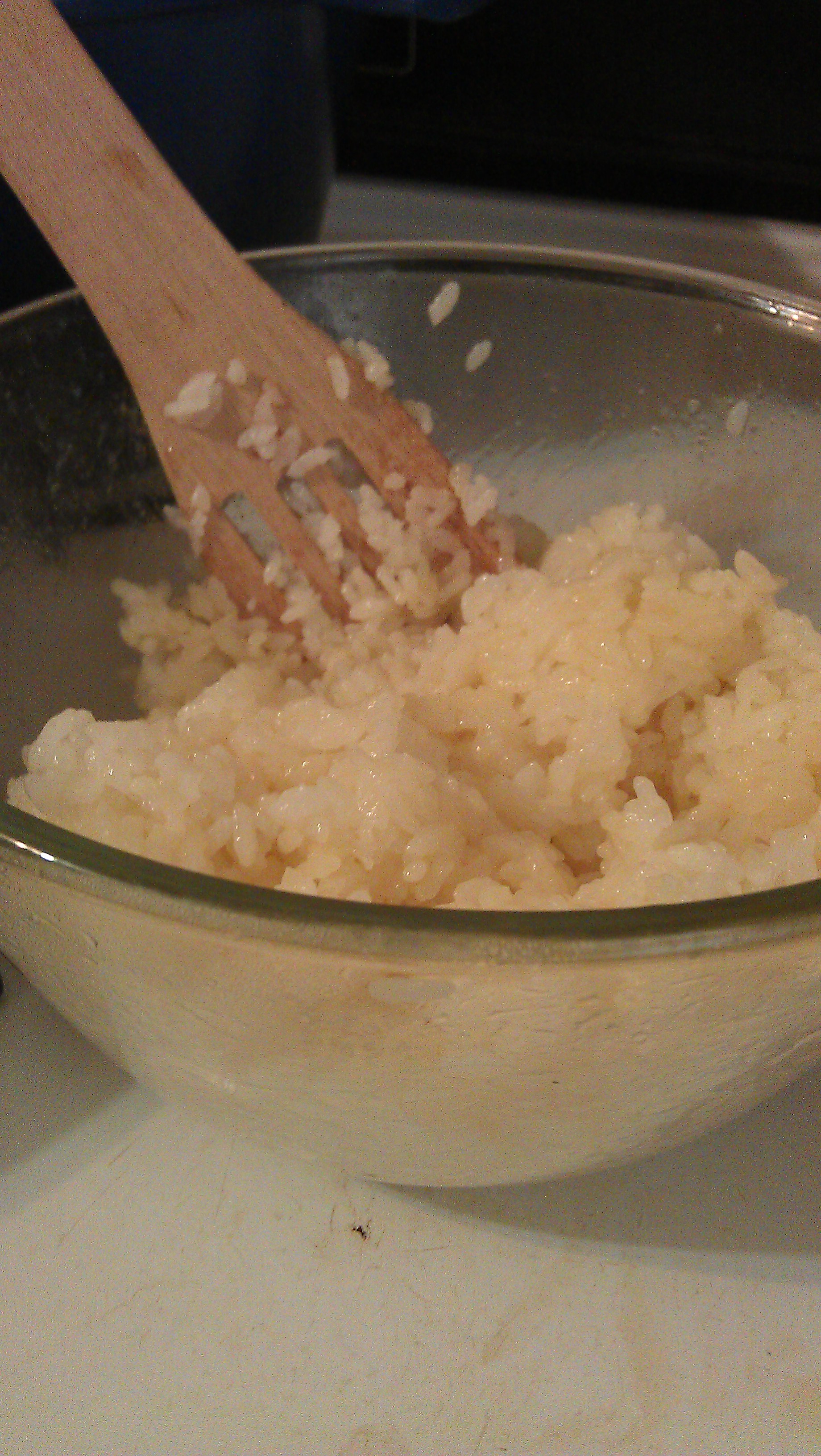 7. When the rice is cooked transfer to a wood or glass bowl and mix in sushi vinegar delicately folding it in so that you don’t crush the rice. Allow to cool till you can handle it with your hands.