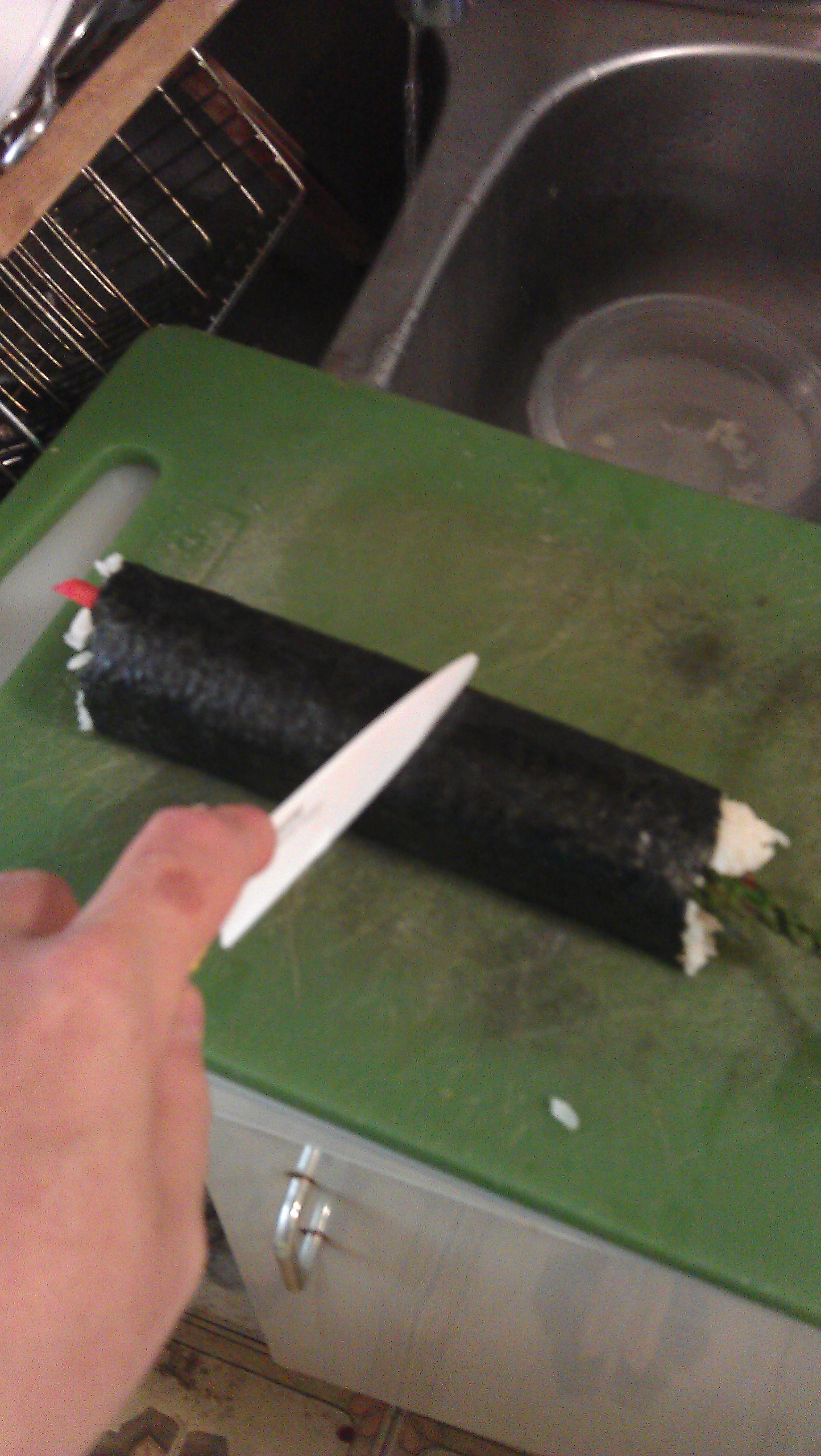 6. Wrap your bamboo mat in plastic wrap. This is the one essential maki making tool. It ‘s usually wrapped because it’s hell to clean but since we didn’t have any plastic wrap, we just went for it and survived.