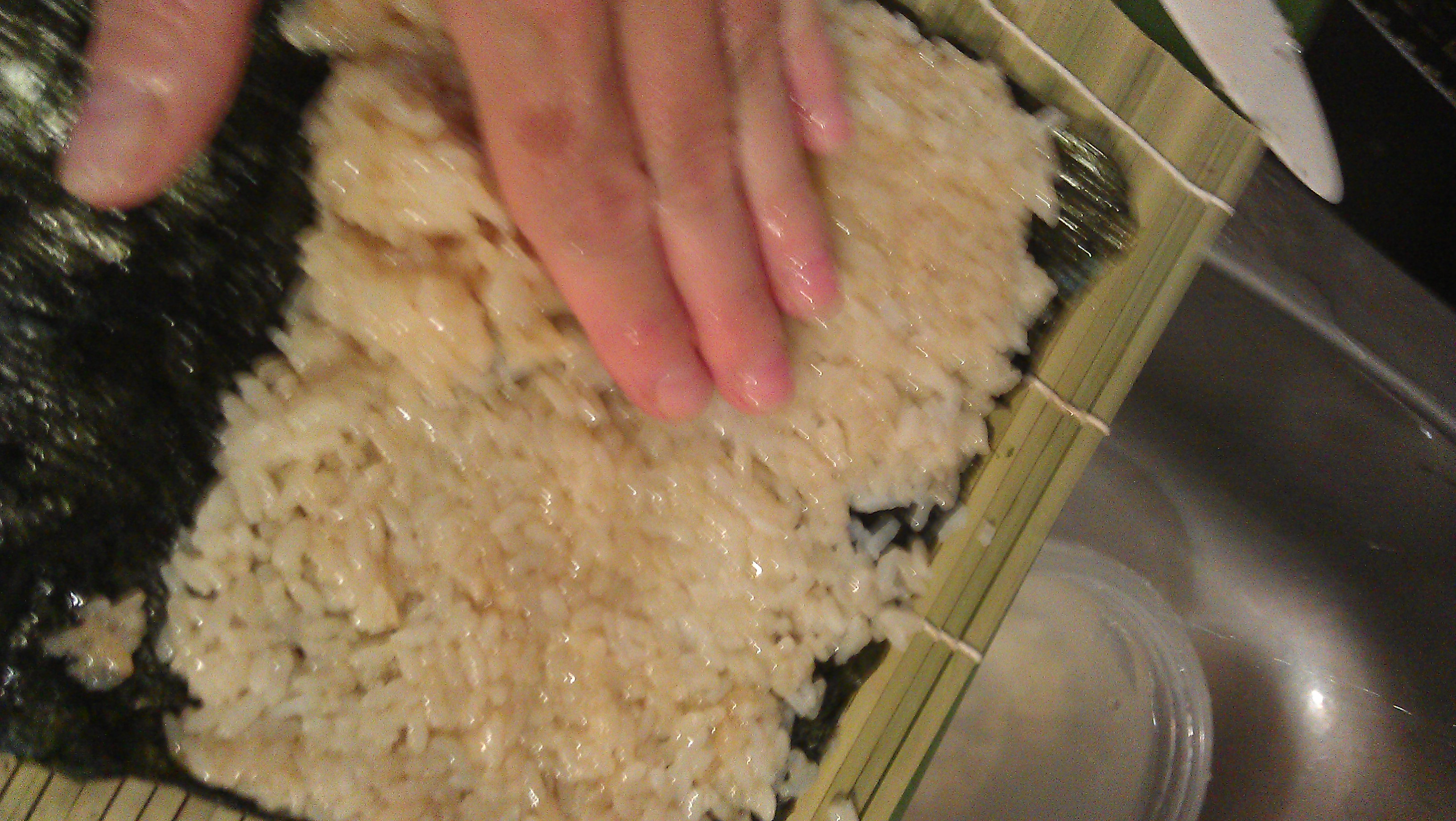 8. Place a sheet of nori on the mat. Close to one side. The coarser side should face up and the lines should be aligned parallel to your body. Keep a bowl of water with a touch of rice vinegar on hand an moisten your hands. Pick up a handful of rice mold into a ball and spread across the nori till it is fully covered except for ¾ of an inch at the top. Keeping your hands wet will make it much easier to spread the rice and control the thickness and evenness of the layer.