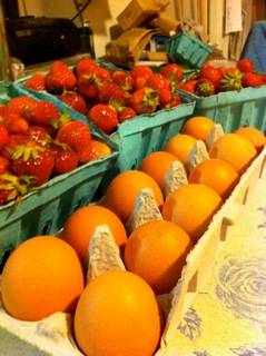 So here’s what we get at my house: James and I live together and get pretty much everything we can from the CSA. Since veggies haven’t started yet, right now, we get a berry share. We also get an egg share that we split with Caroline and a meat share that we split with Ryan & Rachael. This week was Ryan and Rachael’s turn to pick up the meat, so we didn’t get anything new, but we still had some stuff in the freezer from previous weeks. Until veggies start, the CSA is more of a wonderful dietary supplement, and we end up eating a lot more meat than we normally would. Most of the veggies in the entries below are from the Farmer’s Market or co-op. When we start getting lots of veggies each week, CSA food will be pretty much all we eat, except for a dinner or two out per week.
