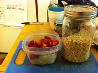 Breakfast: I forgot to buy yogurt again. So I had strawberries and oatmeal. Better than the stale roll, but not quite the deliciousness that I know those strawberries are capable of.