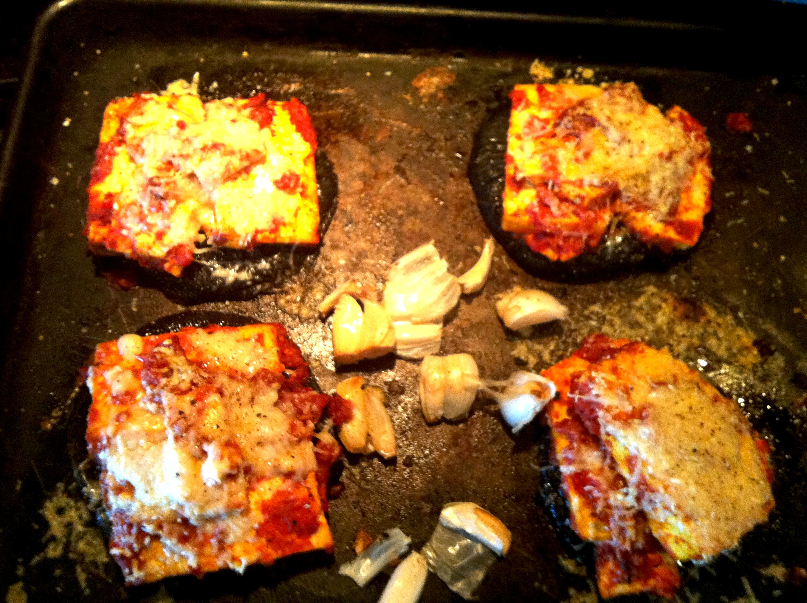 First, drain and pat dry the tofu, then marinate in the tomato sauce for about 30 mins to an hour. In the mean time, trim and clean your mushrooms, drizzle them on both sides with olive oil and sprinkle with salt and pepper. Chop off the top of the garlic, drizzle some olive oil and sprinkle some salt on top and pace in the pan with the portobellos. Roast at 350 degrees for about 30 mins. After 30ish, take them out, turn the mushrooms on their backs, evenly distribute the marinara tofu, making sure to get as much tomato sauce as possible on each mushroom then cover each with a good amount of pecorino. Roast again for about 20 mins. Take out, serve immediately with chunks of roasted garlic as the garnish- very important to get the mushy garlic in every bite. Salt and pepper to taste.