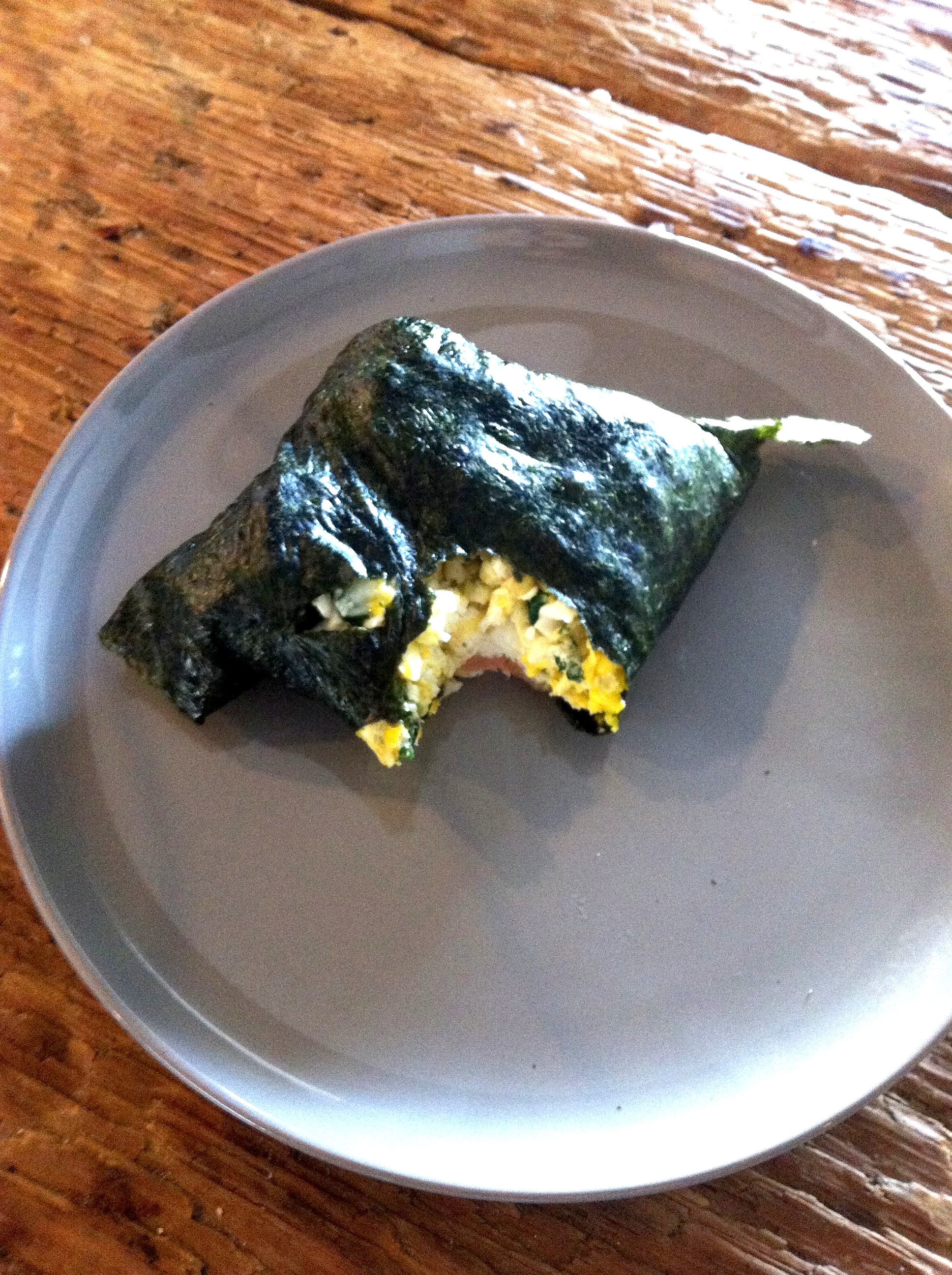Another thing we have been really in to lately is making toasted Nori wraps out of pretty much anything we have in the fridge- leftovers are especially good for this. All you have to do is toast your Nori sheets either in a skillet or over a low open flame until the green starts to show. Then lay on a plate, fill with brown rice, soba noodles and whatever protein or veggies you want, fold the edges up to make a square and eat! Very yummy and very good for you. Below, I have created breakfast wraps out of brown rice, scrambled Southside CSA eggs with scallions, smoked salmon and Sriracha hot sauce: