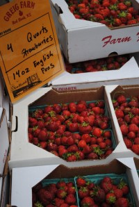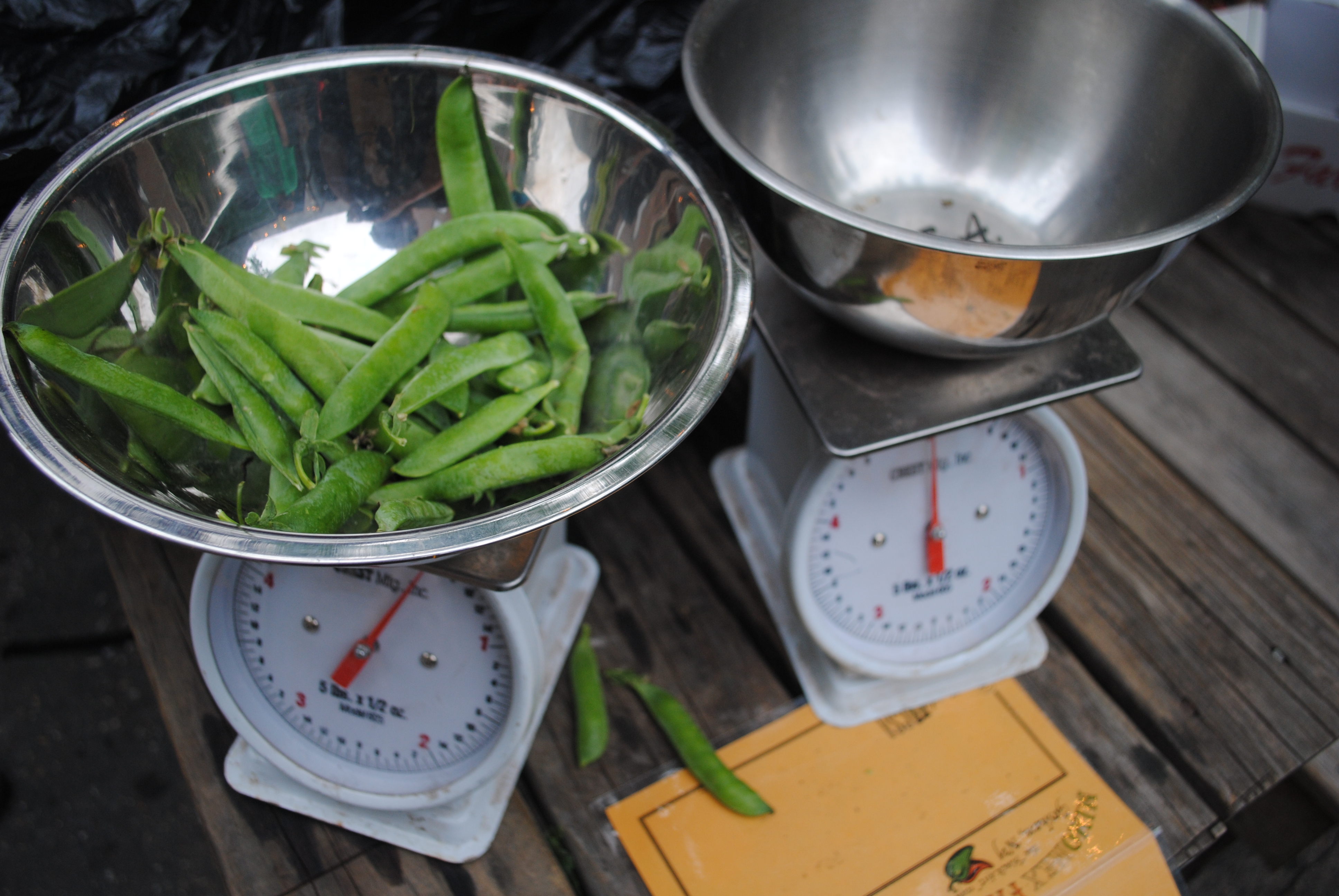Norm grows several varieties of strawberries. Picking berries from different flats = different types of lusciousness. Just look for differences in size and shape. The peas this week are different from the previous week; These are shelling peas meaning most people find the shells too fibrous to eat. However, they are great in stocks and I bet you might be able to pickle them.
