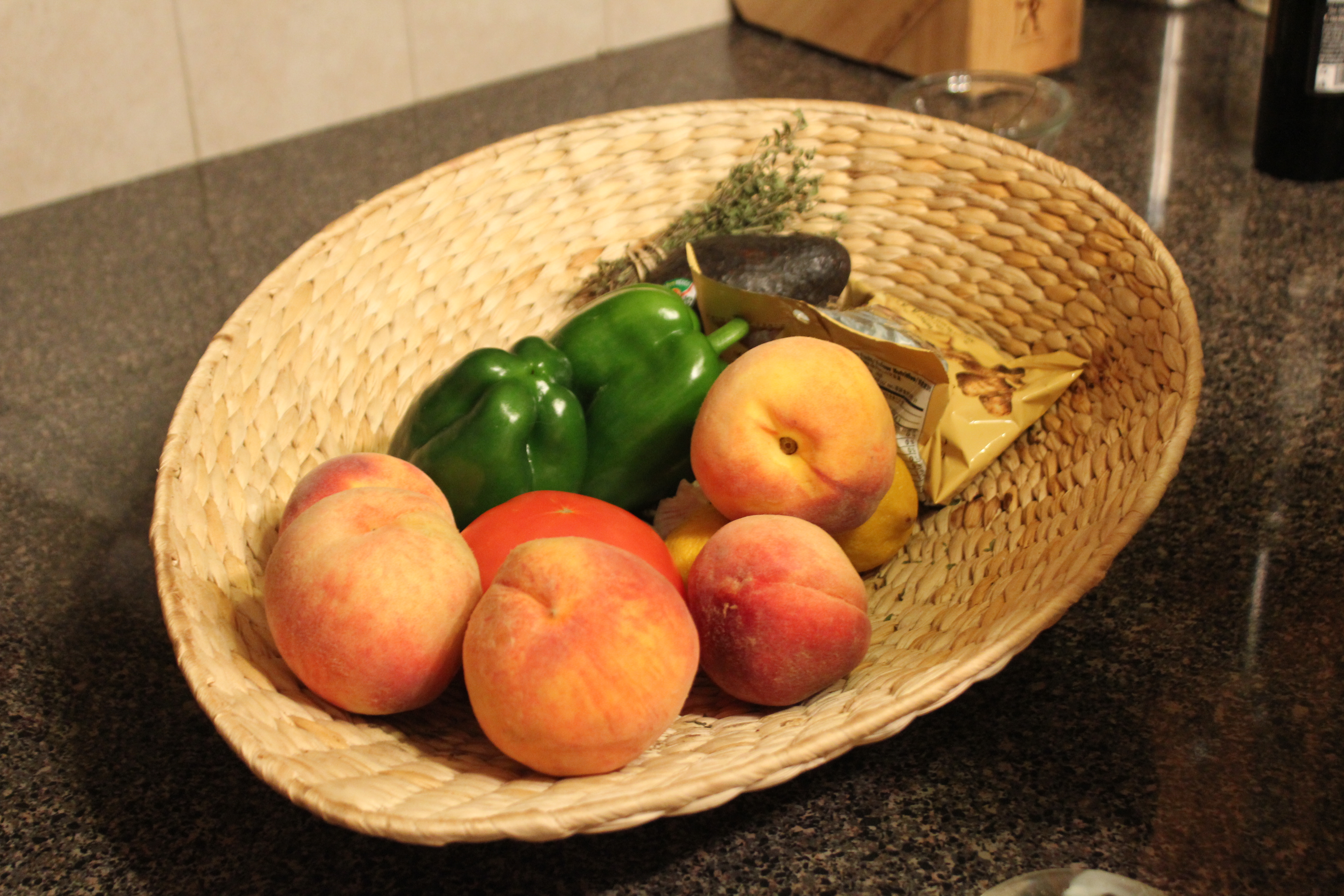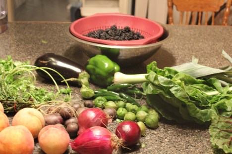 This week we had: a leek, pepper, potatoes, tomatillos, cilantro, jalapenos, red onions, peaches, and blackberries.