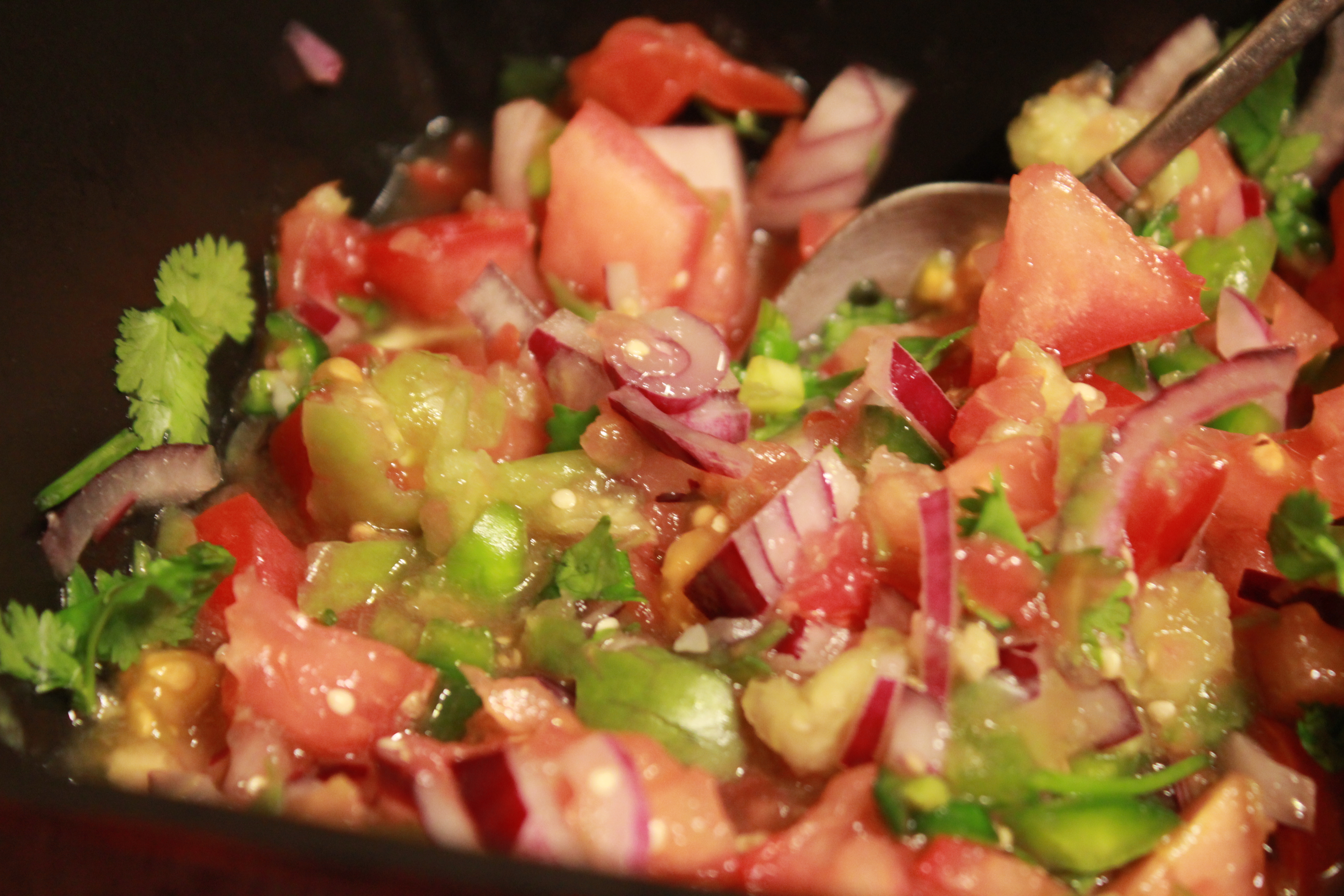The rest of the week, we made two dinners out of our share (plus tonight’s dinner, which is not pictured). One night we had rice, beans, swiss chard (this week’s share), chicken sausage, red cabbage (from prior week), corn (prior week) and a salsa. For the salsa, we used tomatillos, one red onion, jalapeno and the green pepper, and cilantro from a previous week, all from the share. There were enough leftovers for the two of us to bring lunch to work the next day.