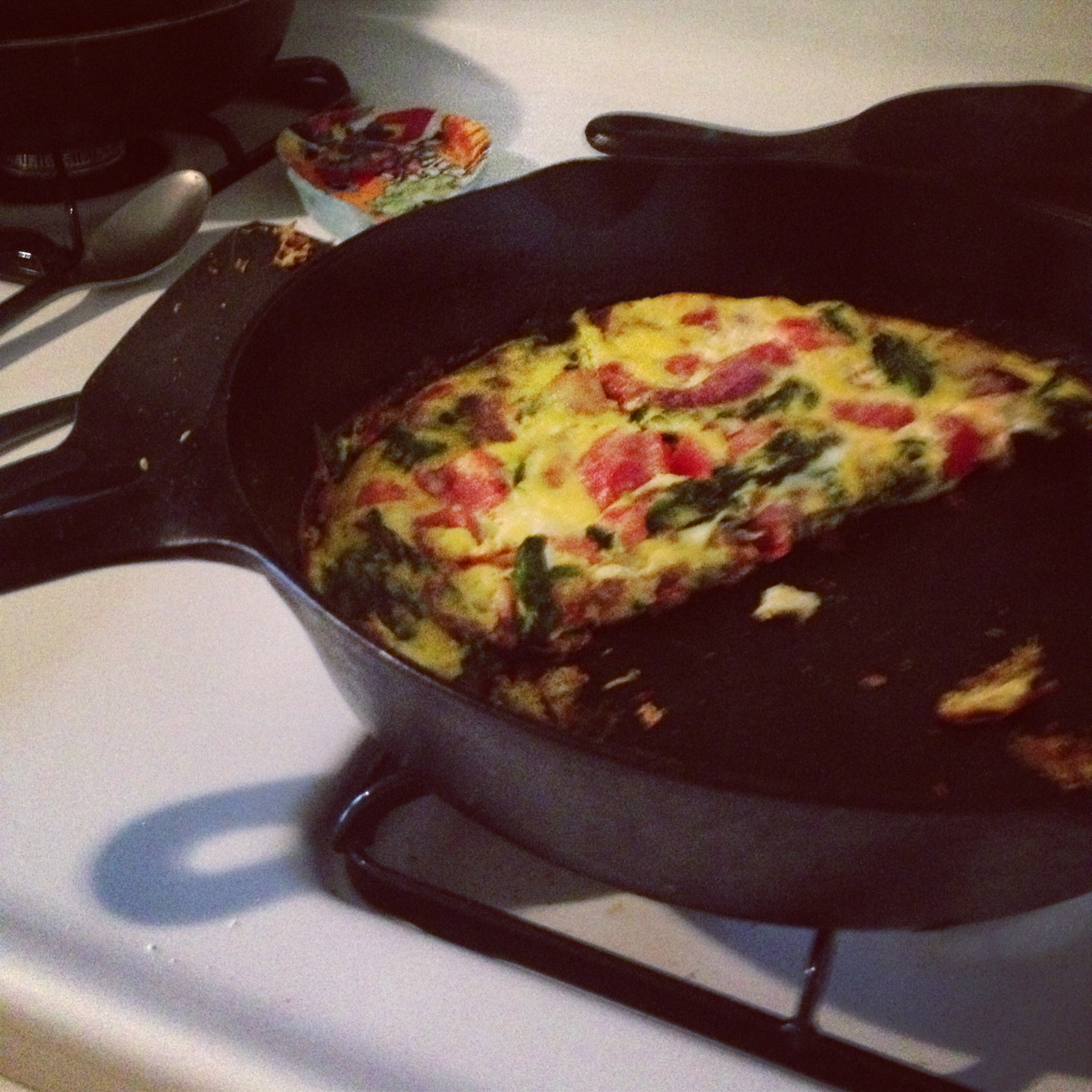 The next morning we awoke to the idea of making a frittata using some of the Eggs we got at our previous pick up. We also threw in some of the red onions, tomatoes and spinach. Needless to say, we were quite happy!