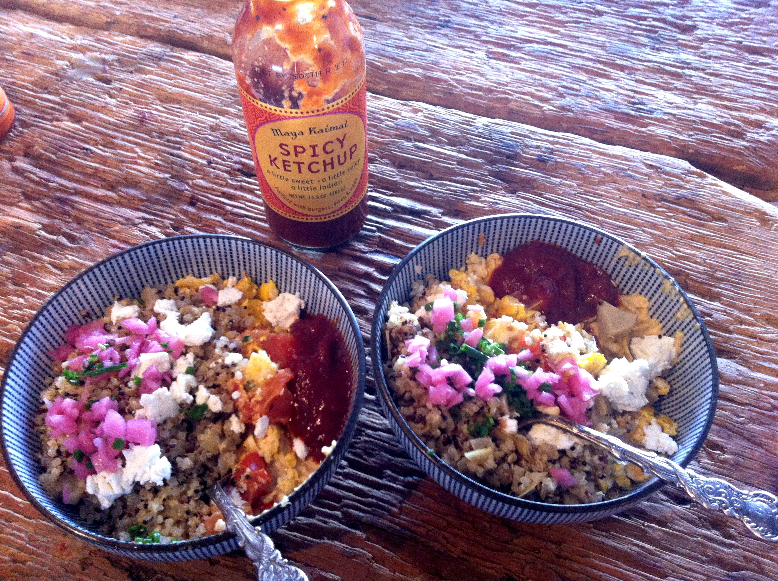 -Scramble the eggs lightly until done and add to the bowls with a sprinkle of salt and pepper and some spicy ketchup.
