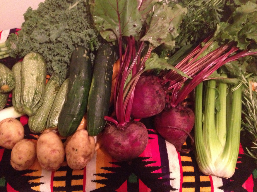 This is my sharemate and I’s inaugural year with the Southside CSA and the Bridge share is the highlight of our Mondays. One us is from a ranch on the West Coast and the other is related to the head of Slowfood USA so we were thrilled to find such an awesome option in NYC. Despite the heat wave last week, we had our oven roaring and put together some fantastic dishes including walnut zucchini bread, a salad with roasted leeks and potatoes and roasted kale and beet quinoa.