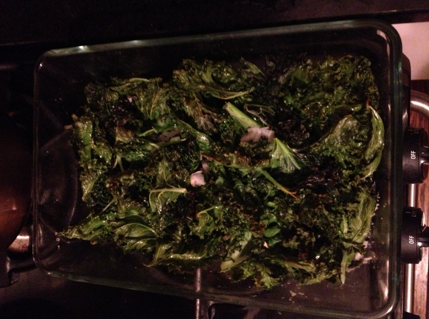- Meanwhile, cut or rip the kale leaves from their thick stems, and rip into bite sized pieces. Mince the garlic cloves. Place the kale leaves and garlic in a large casserole dish, pour on enough oil to coat, plenty of salt, and pepper to taste, and toss well. Roast the kale leaves in the oven for about 15 minutes, stirring occasionally, until they smell toasty and start to brown on the edges.