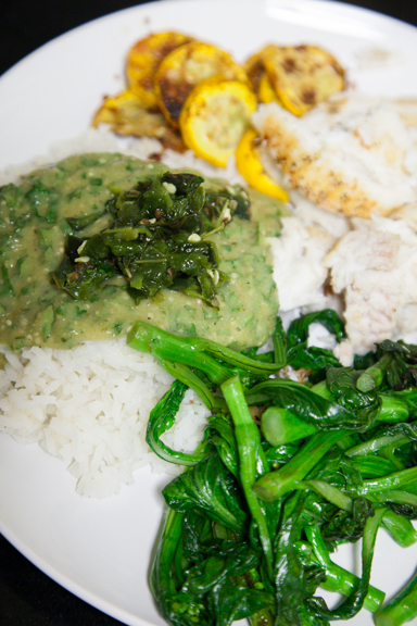 Sautéed Bok Choy, Rice with Tomatillo Sauce, Squash & Fresh Fish