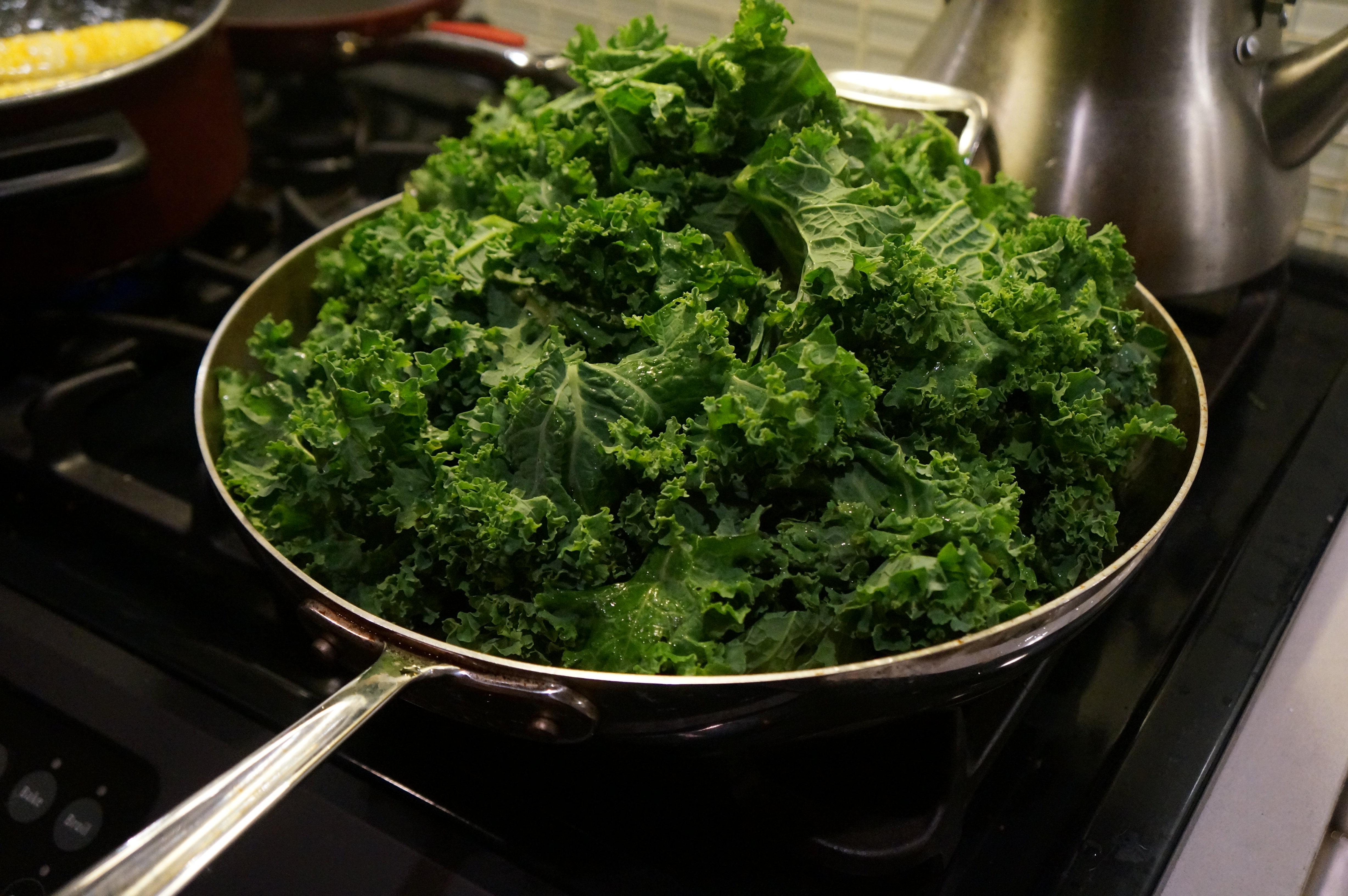We’ve made lots of things with kale- kale chips, raw kale salad, used it in baking with other things. But this is one of the simpler and tastier ways to use it as a great addition to a meal. We heat up some olive oil and some crushed or minced garlic in a pan. After giving the kale a good rinse and getting rid of the thickest stems, pile it all on there. Mixing and tossing it around every couple of minutes as the kale reduces and after about 12-15 minutes you have a great dish. The before and after picture are important because you shouldn’t be afraid to really throw all the kale in there and fill it up, because it reduces quite a bit!