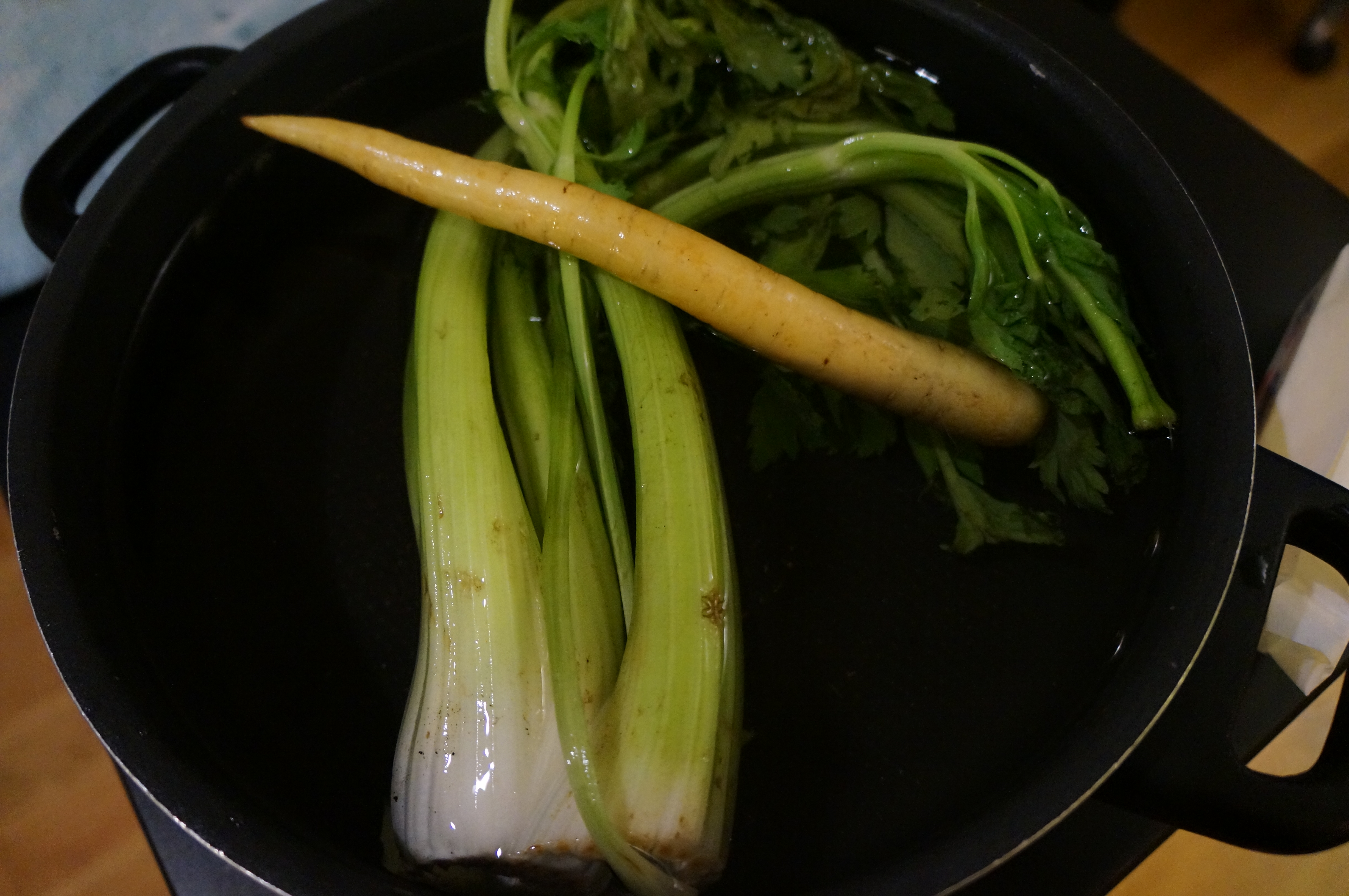 The first step involved steaming the wings, which we did using our spaghetti pot with the strainer above. After chilling we baked them at 425 for 20 minutes, then immediately tossed them into a bowl with melted butter, hot sauce, and garlic. Bonus: they weren’t fried, so it’s cool to eat extra. We also used some of the celery and carrots from the week before to make the classic accompaniment to wings (as well as a little bleu cheese sauce).