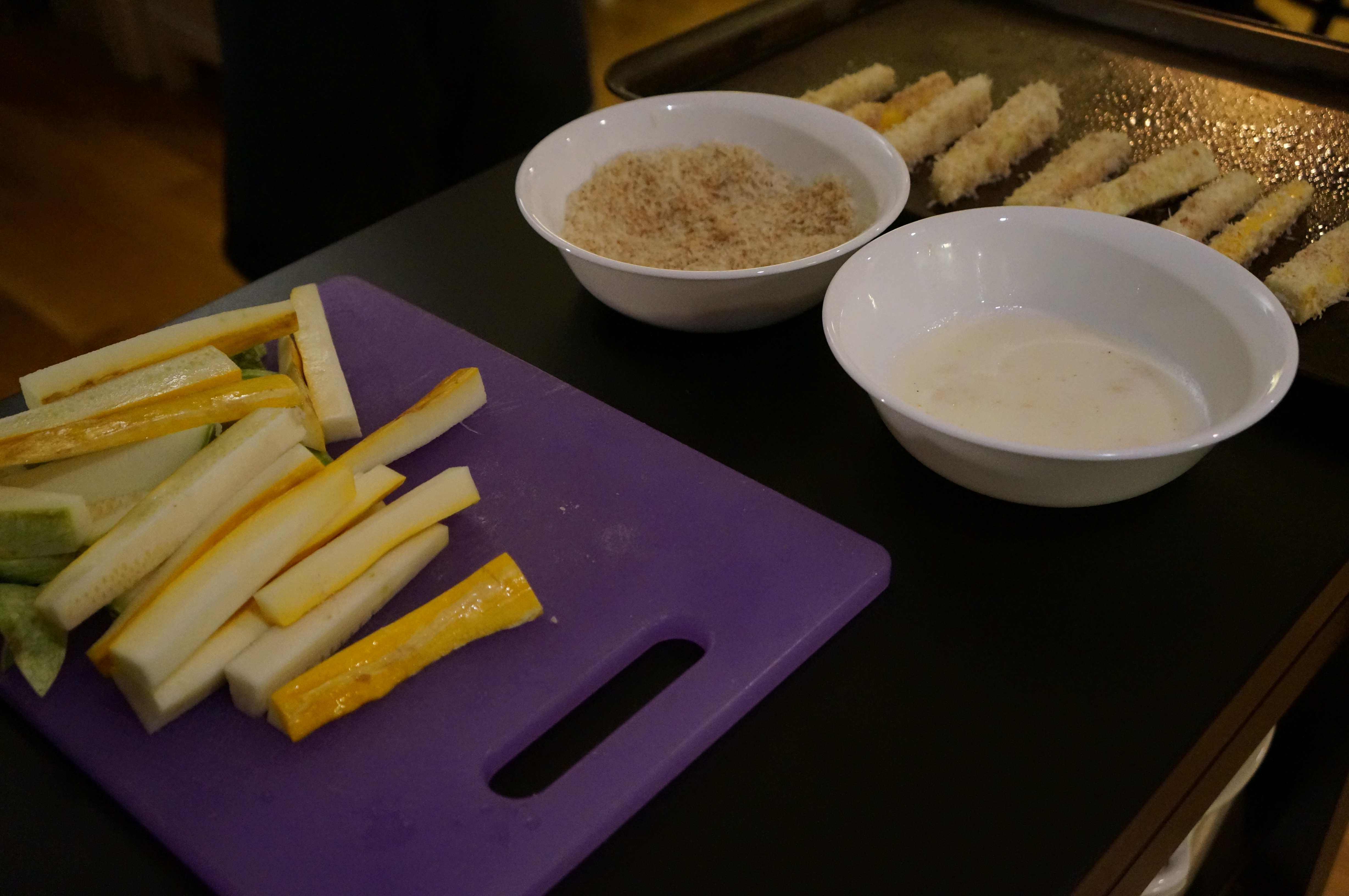We’ve been getting a lot of zucchini lately. So we found a simple recipe for fries. Cutting them up into 3 inch (more or less) strips, they were dipped in a milk/egg white mixture and then coated with a mixture of bread crumbs and grated parmesan. 25 minutes on a greased baking sheet and they were great! This was the basic recipe we followed: http://www.health.com/health/m/recipe/0,,10000001831902,00.html