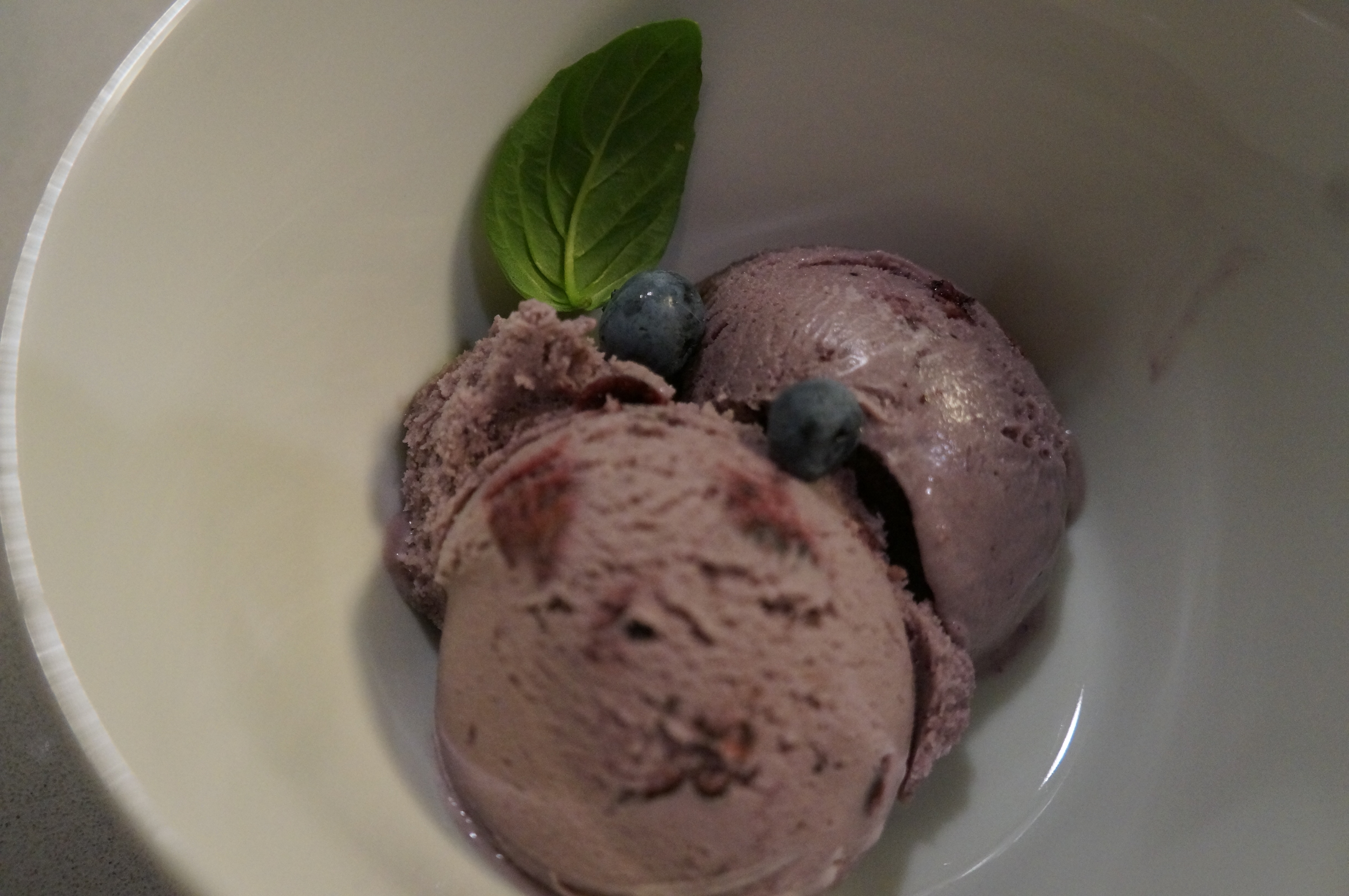 Then we use that ice cream recipe, but instead of using the scraped vanilla bean to infuse the milk, we used another 6-8 fresh basil leaves. Finally, in step 5, right before putting the custard mixture in the fridge overnight, we added the blueberry reduction. Then we put it in our ice cream maker after letting it sit in the fridge 8-10 hours.