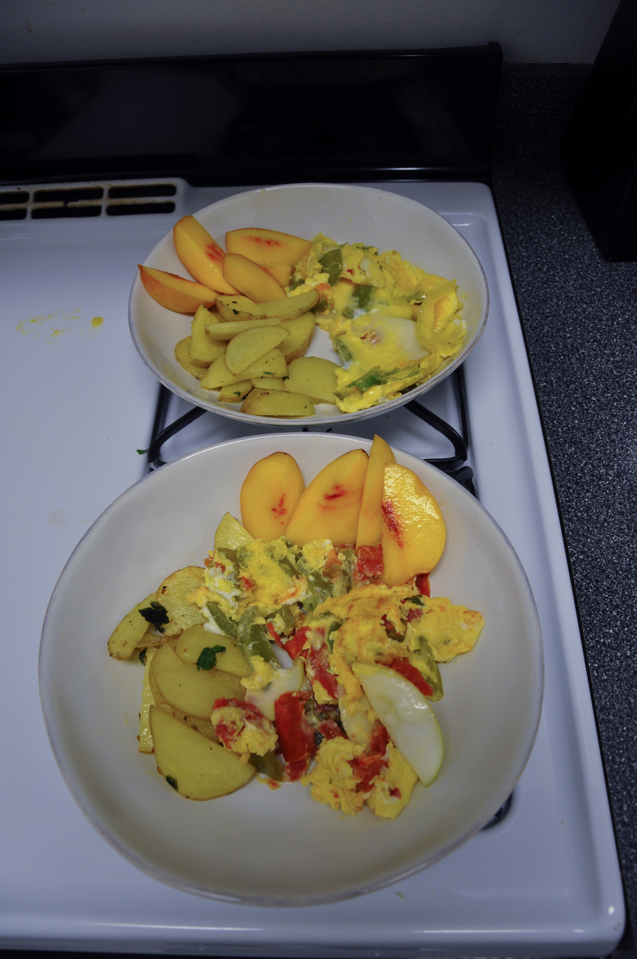 This post features a breakfast menu that utilizes almost every item from this weeks share — Fried potatoes + Egg Scramble + Apple Cinnamon Muffins + Sliced Peaches