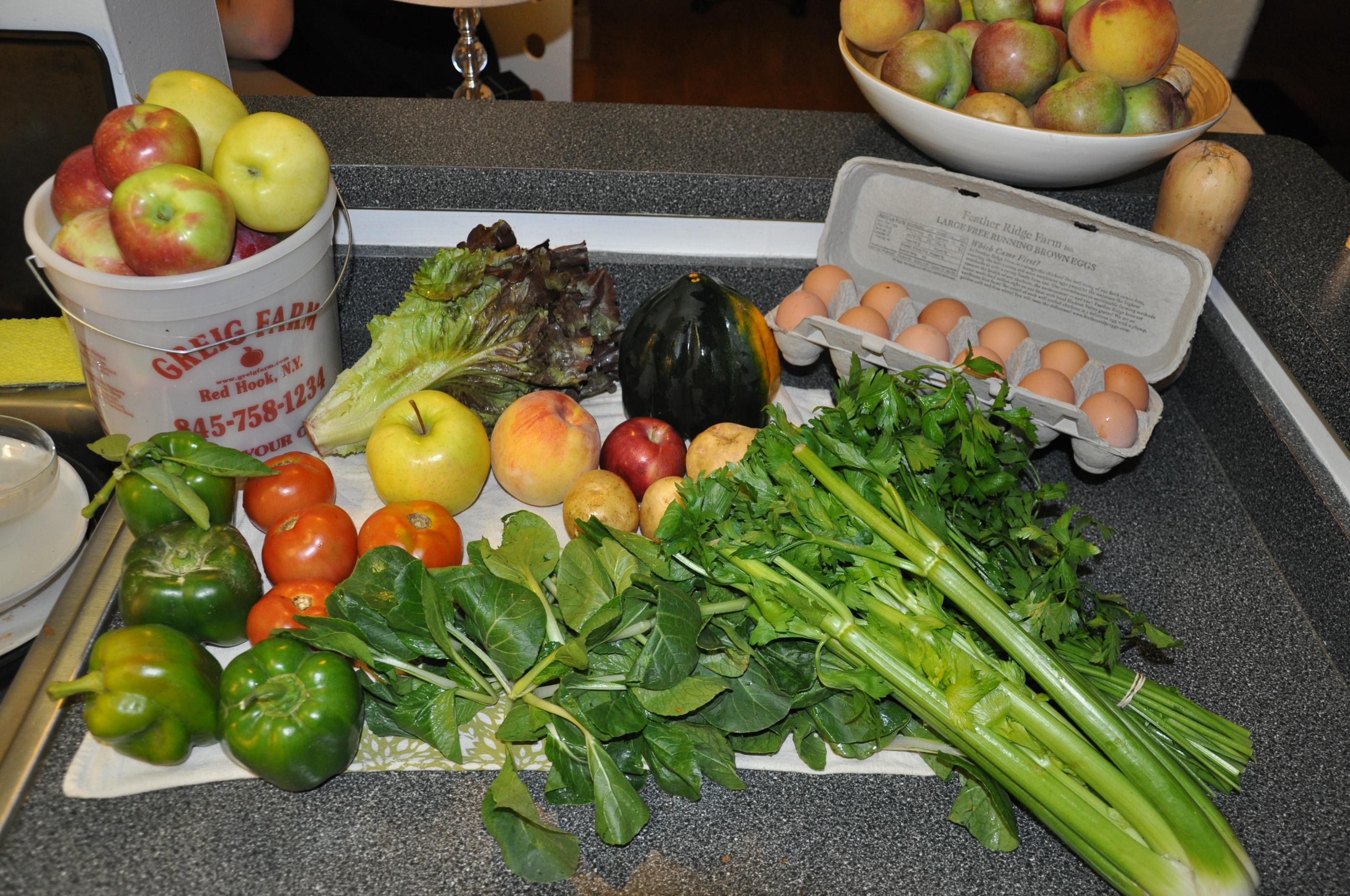 This week’s share included a bucket of apples, peaches, dozen eggs, bell peppers, tomatoes, green lettuce, potatoes, celery, squash and loose bok choy. As I unload the share, I typically wash everything before going into the refrigerator. At the same time, I conjure up recipes for the week.