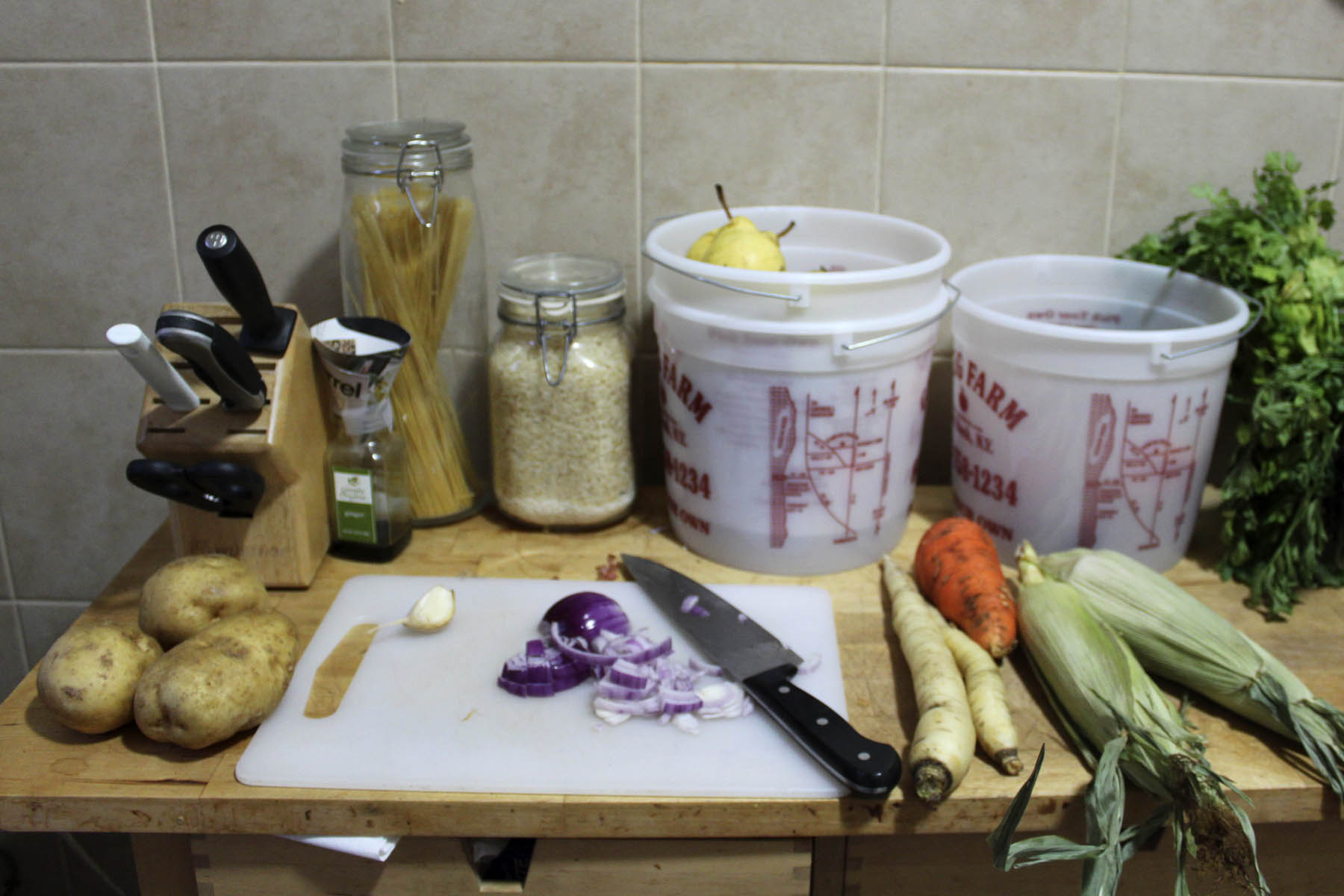 The shared: Pears, Butternut squash, Acorn squash, Carrots, Parsnips, Parsley, and Greens Galore (Kale, lettuce, arugula, and other green things I don’t know the proper name for).