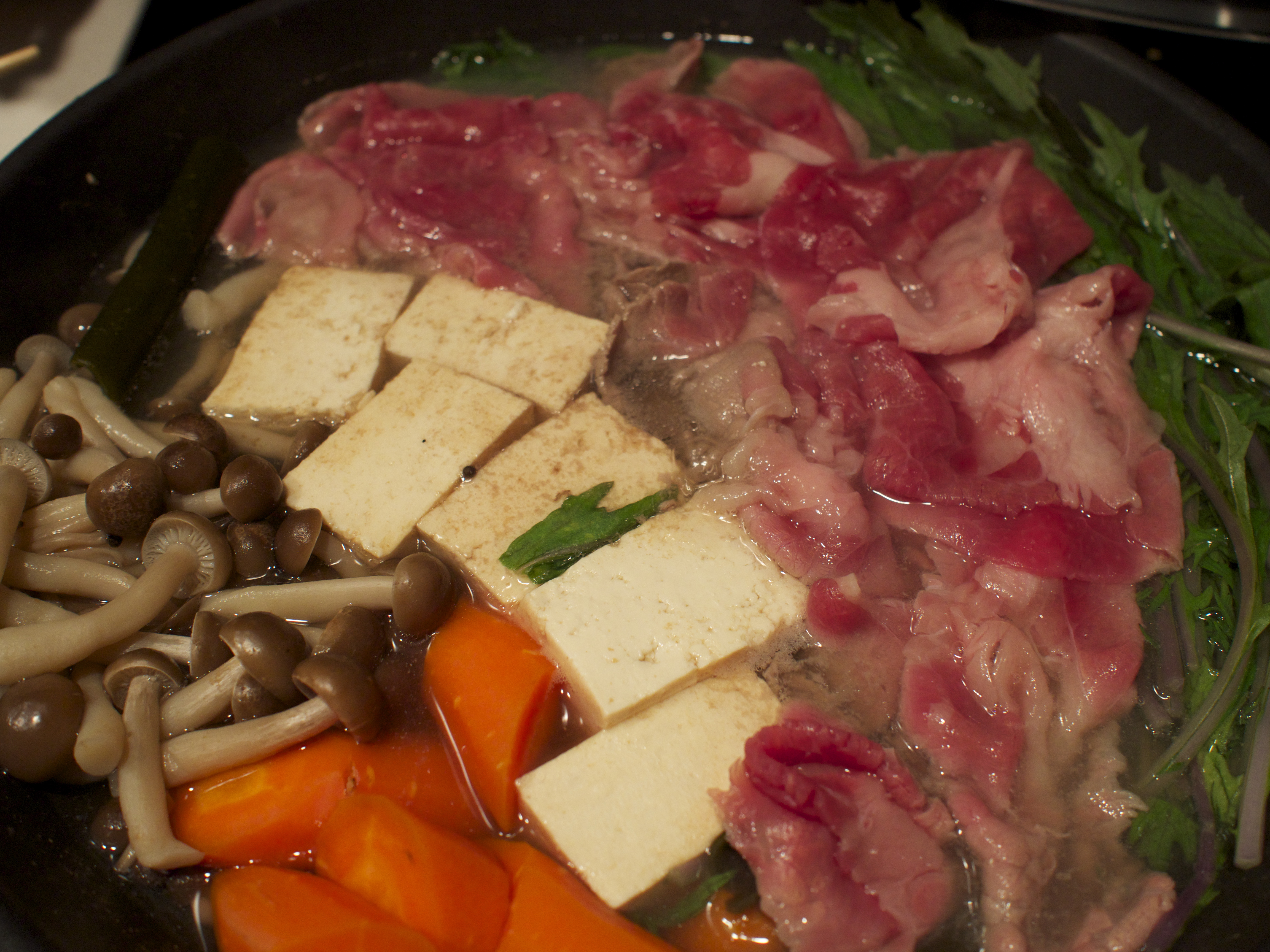 In a skillet, dutch oven, nabe pot or any wide and deep cooking vessel, place the kombu sheet inside then pour 1.5 – 2 cups water and 1/2 cup sake. Turn on the heat to medium high. Place the carrot and tofu in the skillet in sections, then add the mushrooms in its own section.