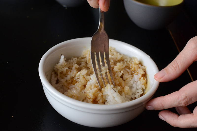 And stir stir stir again, with the rice cooking the egg mixture as you move it around the bowl. Just be careful not to add too much egg or you will get soggy rice with raw egg.