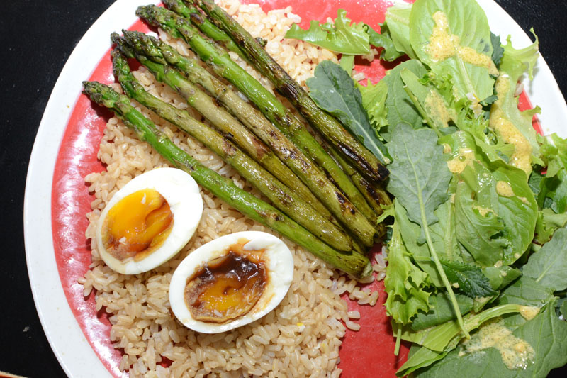 For this meal, we put the soft boiled eggs over brown rice with soy sauce, and ate with a salad and some fresh asparagus cooked on high temp. Delicious.