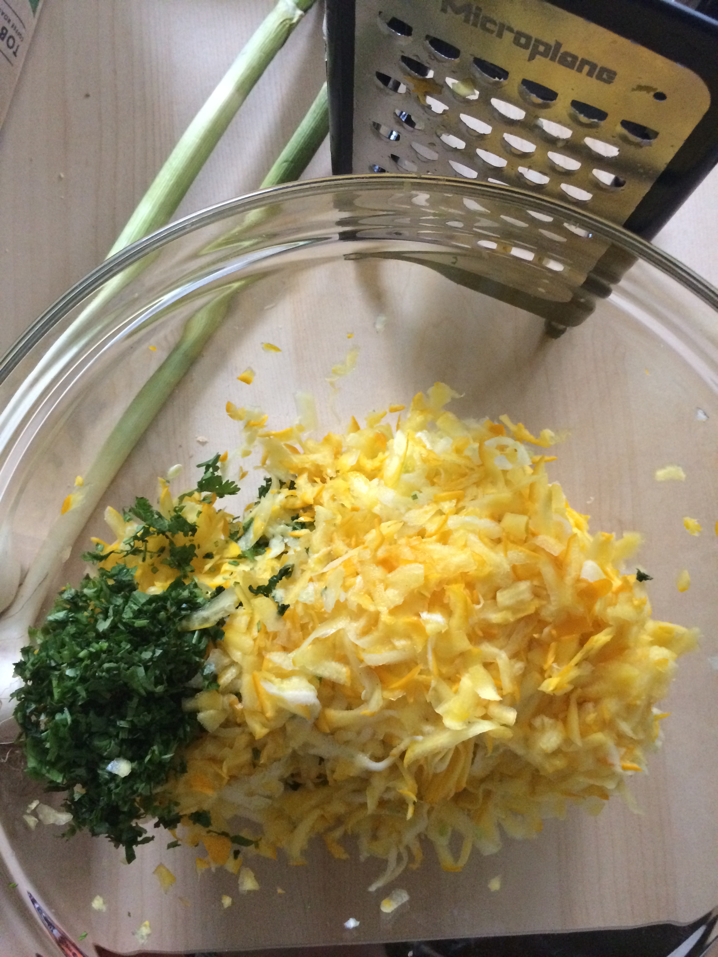 -Put grated zucchini in a colander. Sprinkle with salt and let drain for 10 minutes. Squeeze and place in a bowl.