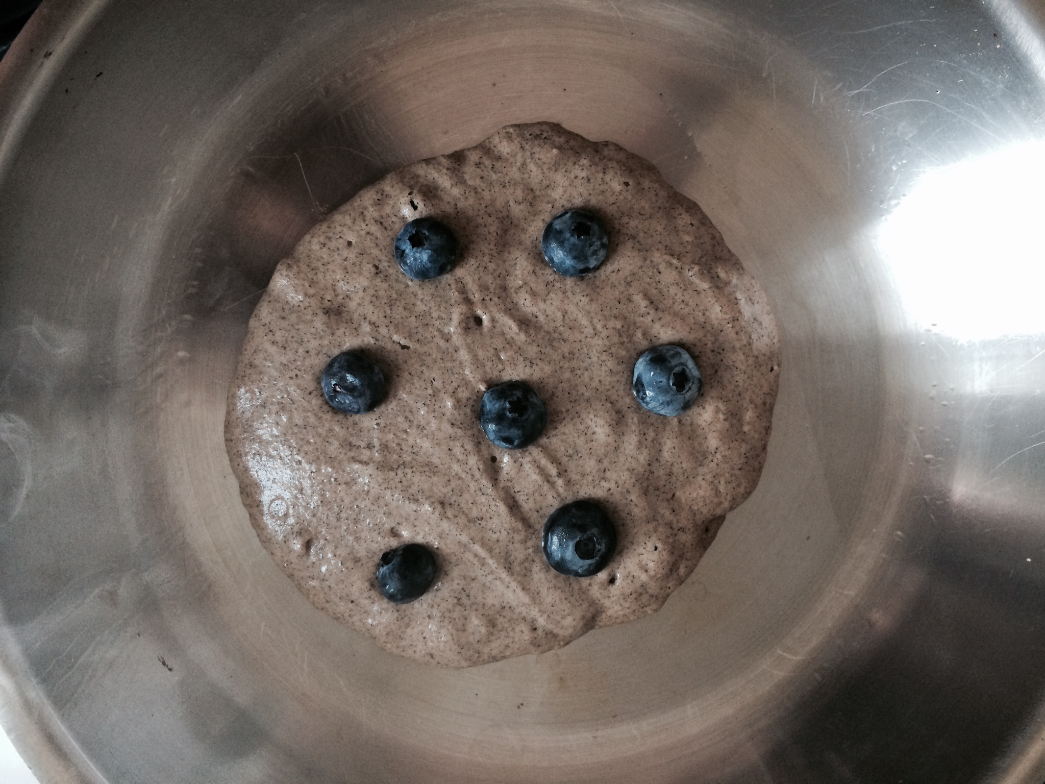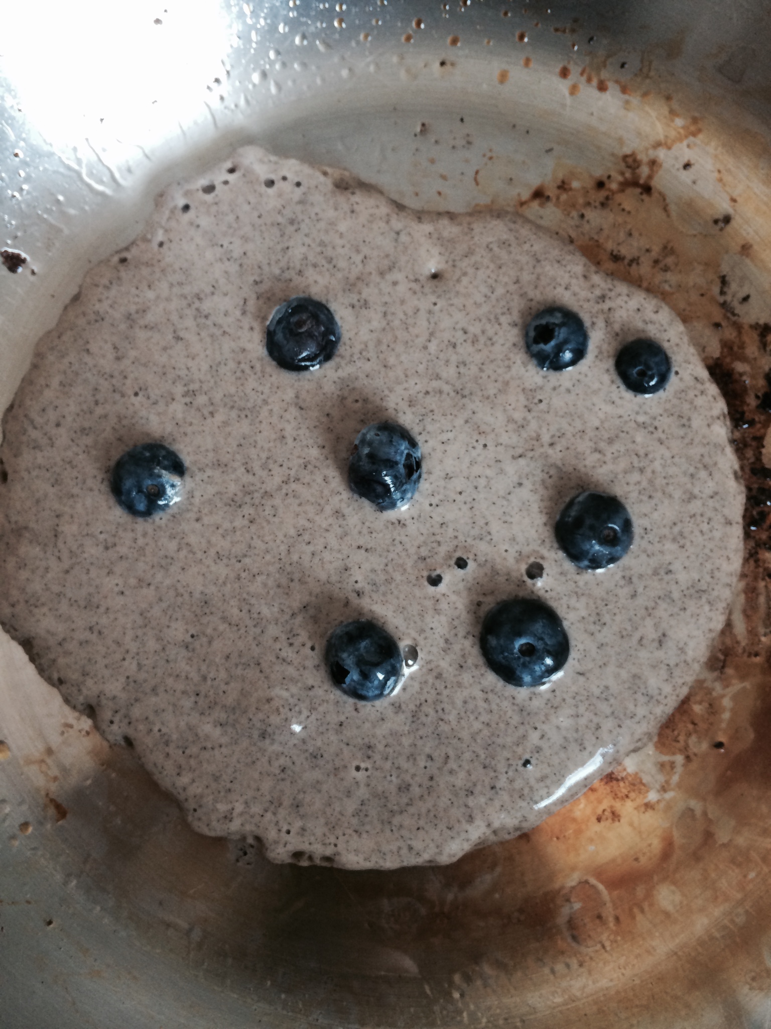 Pour batter into heated pan with refined coconut oil for greasing. Sprinkle fresh blueberries into batter.