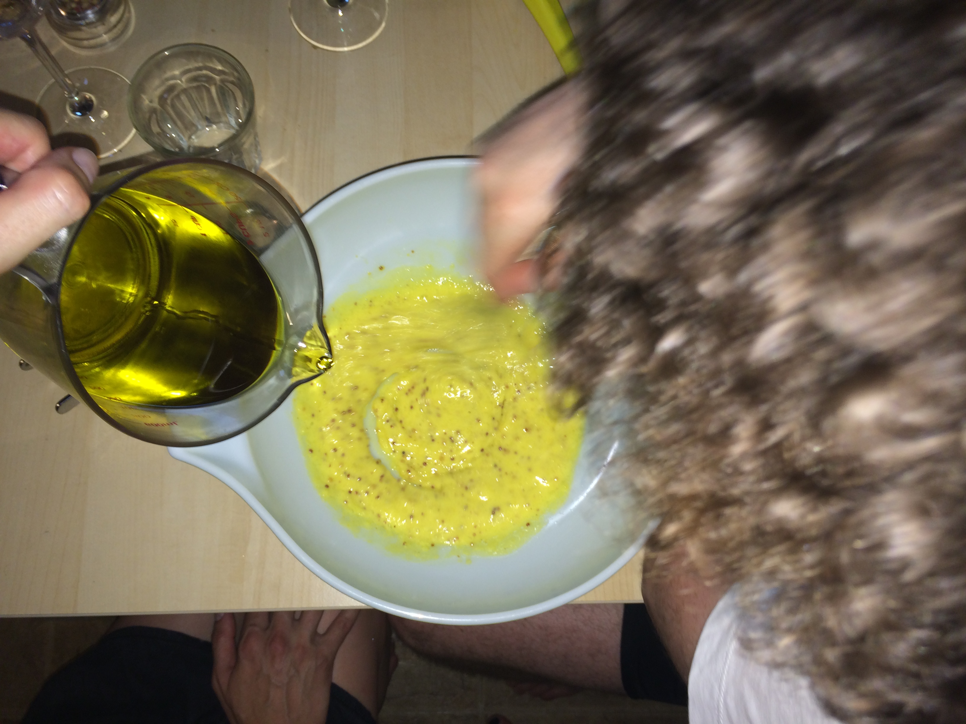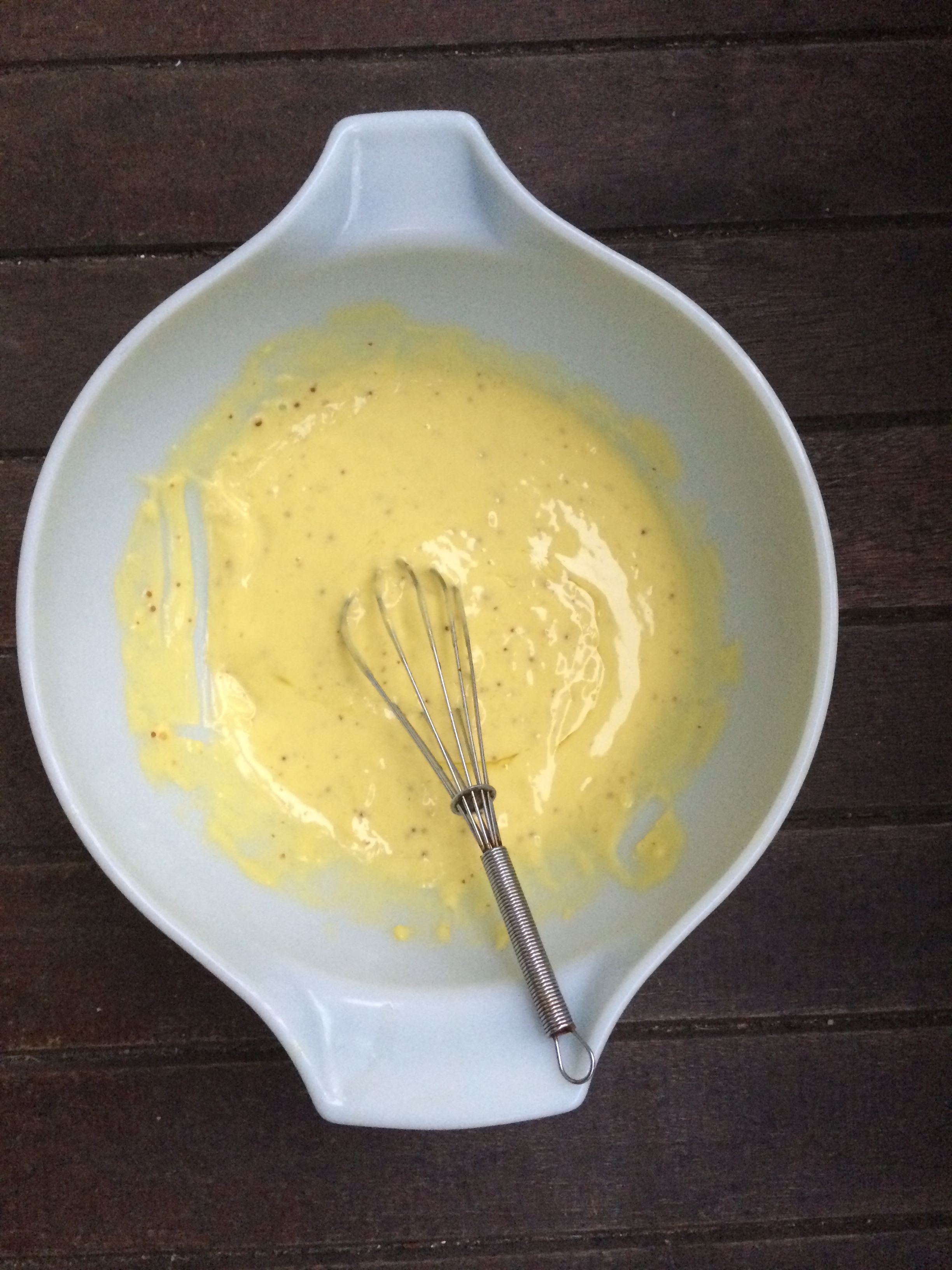 – Combine in a large bowl: juice of 1/2 lemon, 1 tbsp mustard, and 2 egg yolks