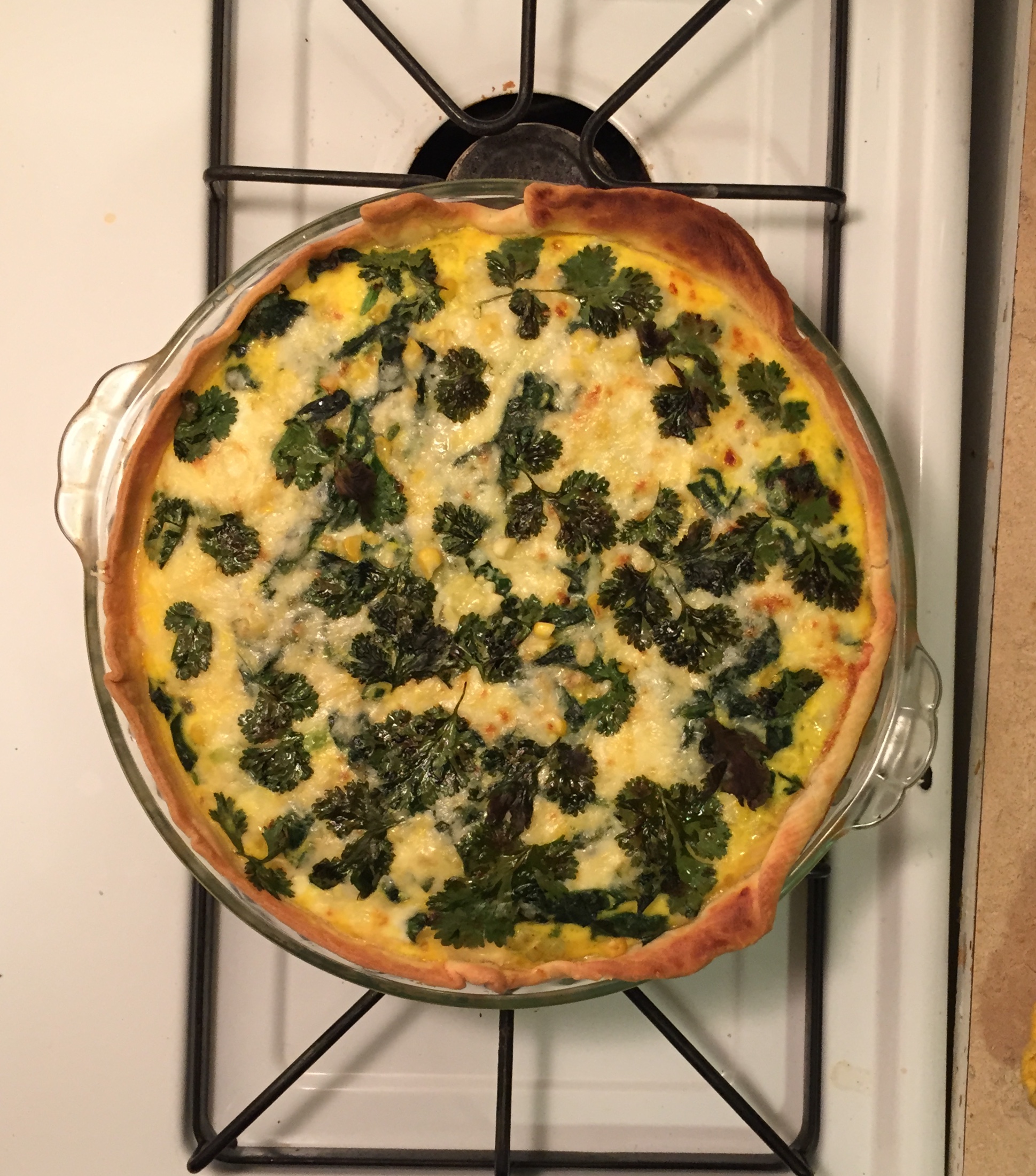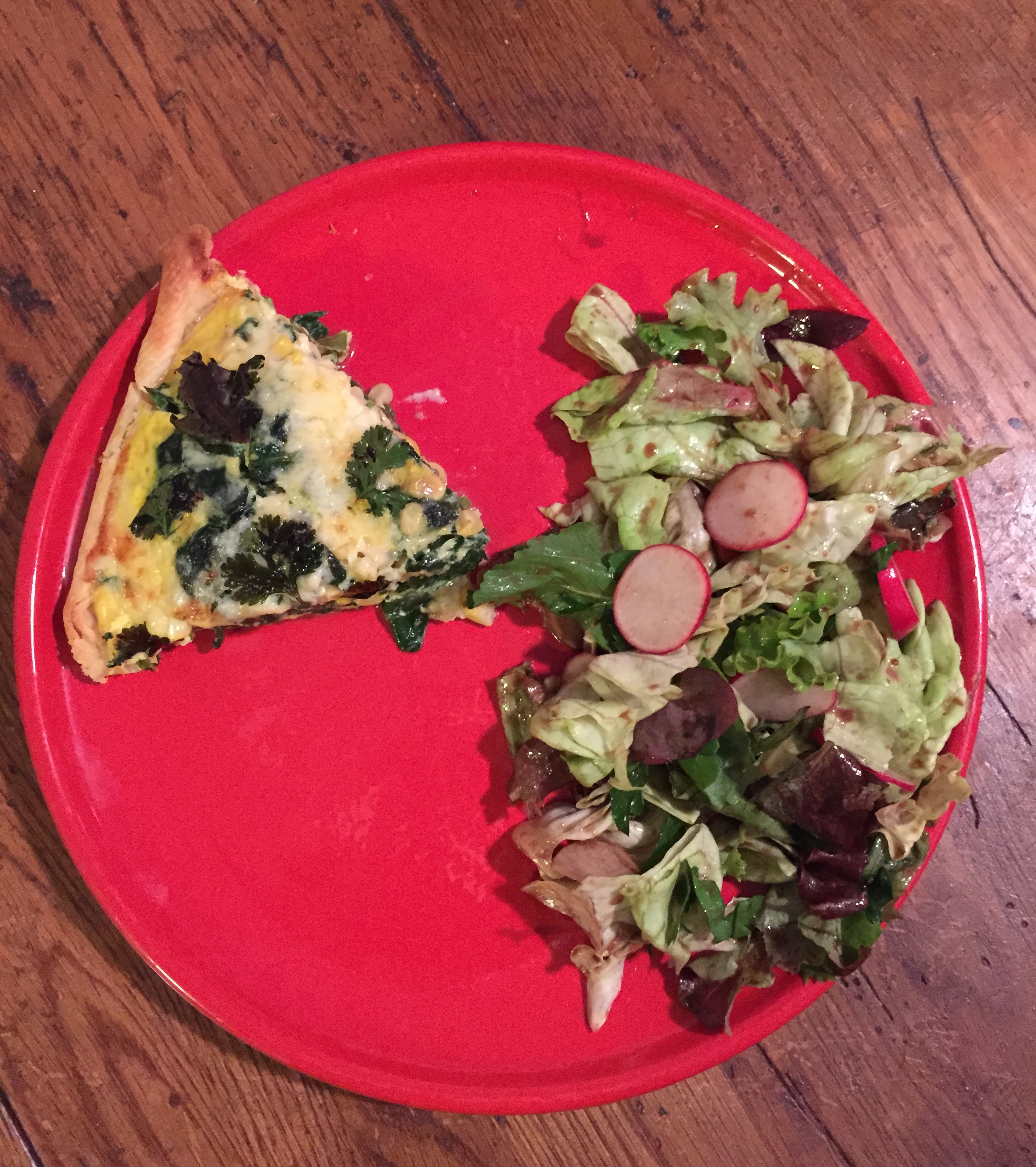Monday: After picking up the share, we decided to make a quiche with the spinach, corn, red onion (from two weeks ago), and eggs from the share. I just used a quick store bought crust, then I just sauteed up the veggies and added them to the crust. Then poured a mixture of 4 whisked eggs and about a half cup of milk plus salt and pepper on top. We added some shredded cheddar cheese and cilantro on top, then baked. This is a quick and easy meal that also makes great breakfasts or lunches throughout the week. We served the quiche with a salad using the Asian mixed greens and the radishes.