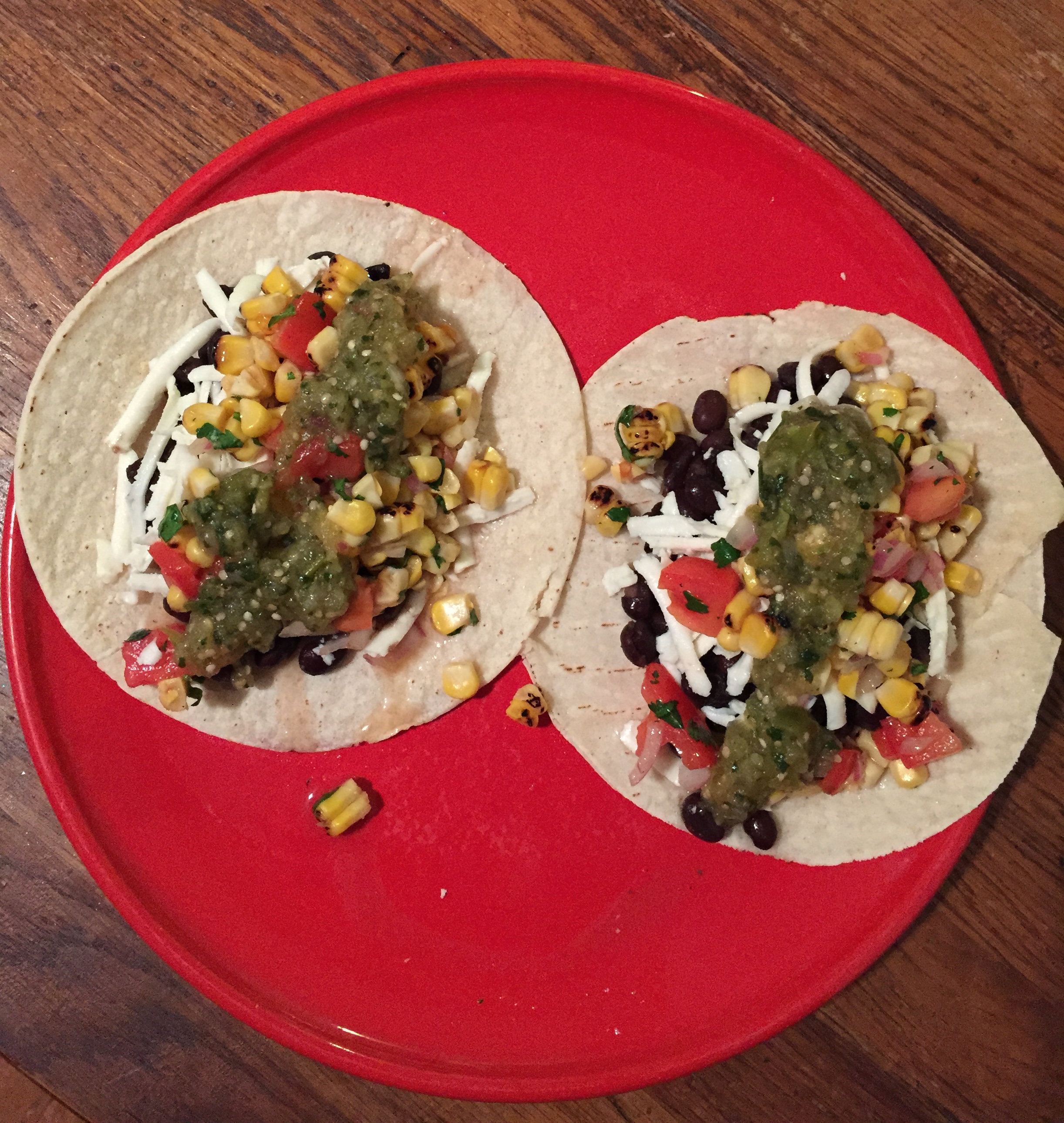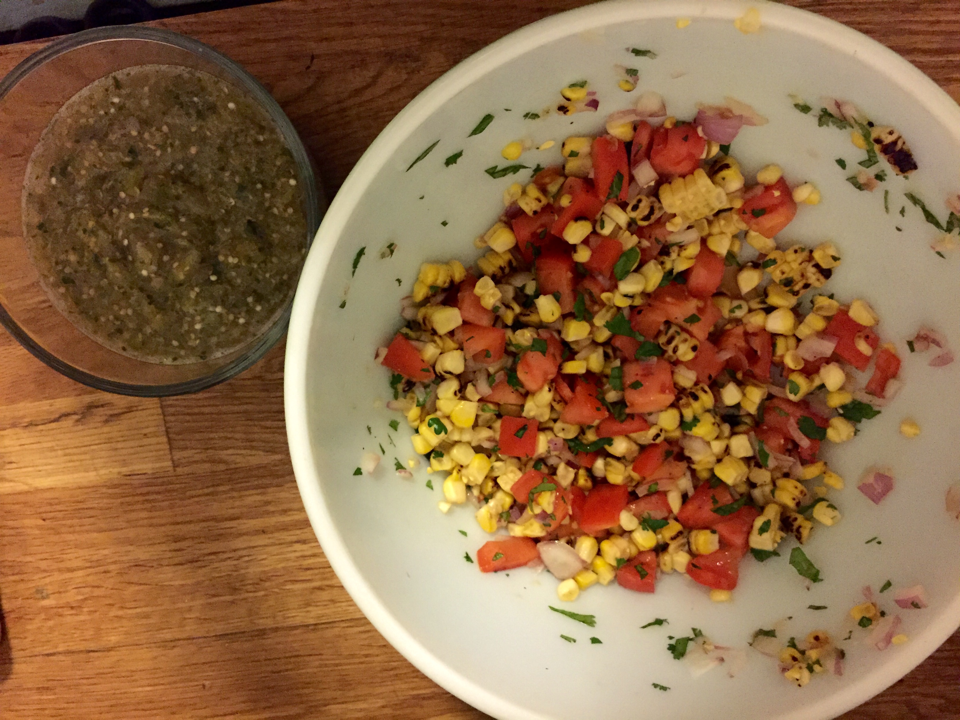 Tuesday: Today we had vegetarian black bean tacos. I just used some simmered black beans and served the tacos with a salad using an ear of roasted corn, cilantro, red onion from 2 weeks ago, and a non-CSA tomato. On top I used a tomatillo salsa that I had from last week that is the recipe that you guys posted a few weeks ago. It is really yummy!