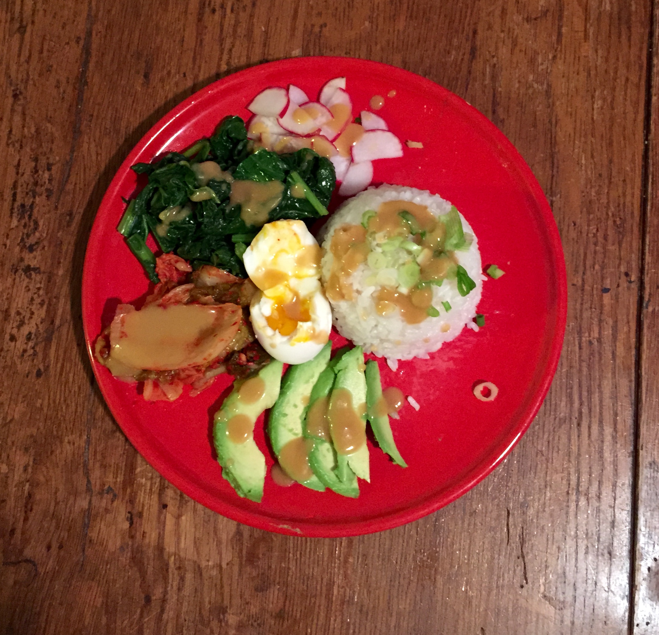 Wednesday: Tonight we had Asian rice bowls (although I served it on a plate!), kind of a mix between Japanese and Korean flavors. This meal is also a good way to use up any random vegetables you may have lying around as you can pretty much throw whatever you want in here. The base is steamed Japanese sushi rice, then I added: steamed mustard greens, sliced radishes, and a soft boiled egg all from the share, plus some sliced avocado, kimchi from a jar that I had in the fridge, and chopped scallions. I just made a dressing with miso paste, rice vinegar, and sesame oil and drizzled that on top.