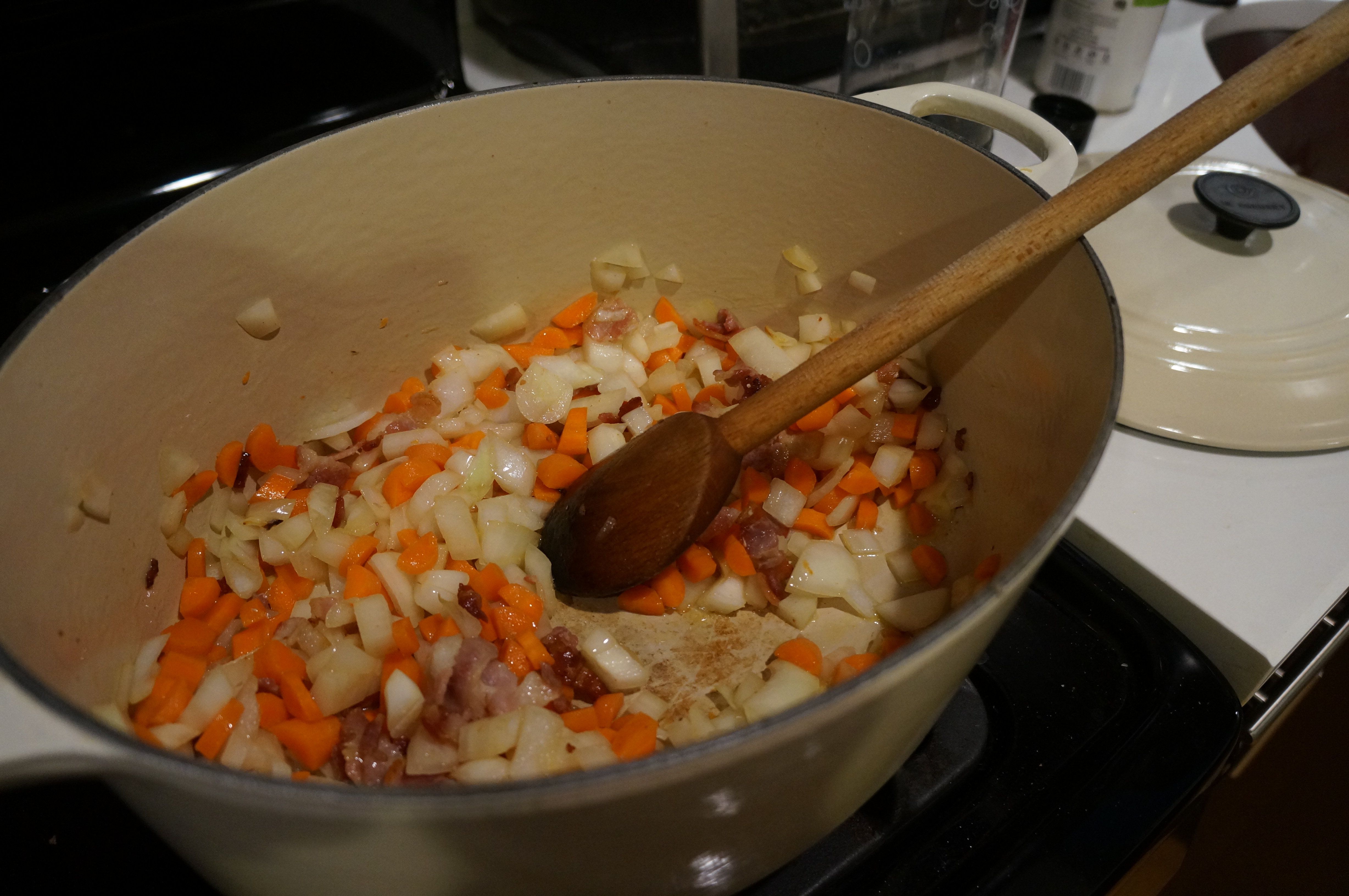 - Start with olive oil and some chopped bacon. Brown.