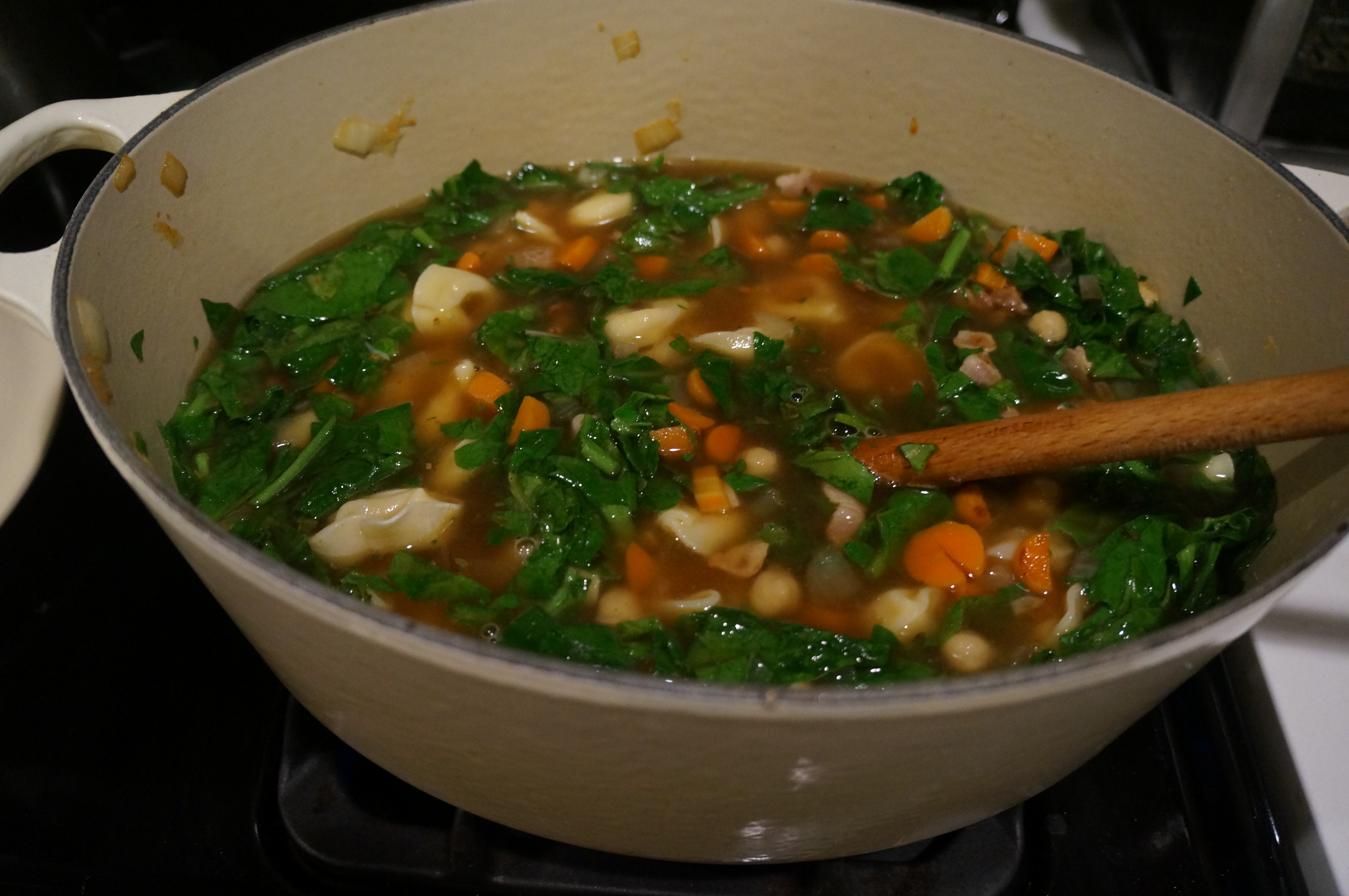 This week was frigid! We figured it’d be smart to start the week with another soup. This one was inspired by the menu at a Hale & Hearty we visited recently. We realized that we had everything except some tortellini, which we grabbed at Target while buying diapers. Ah, the glamourous life!