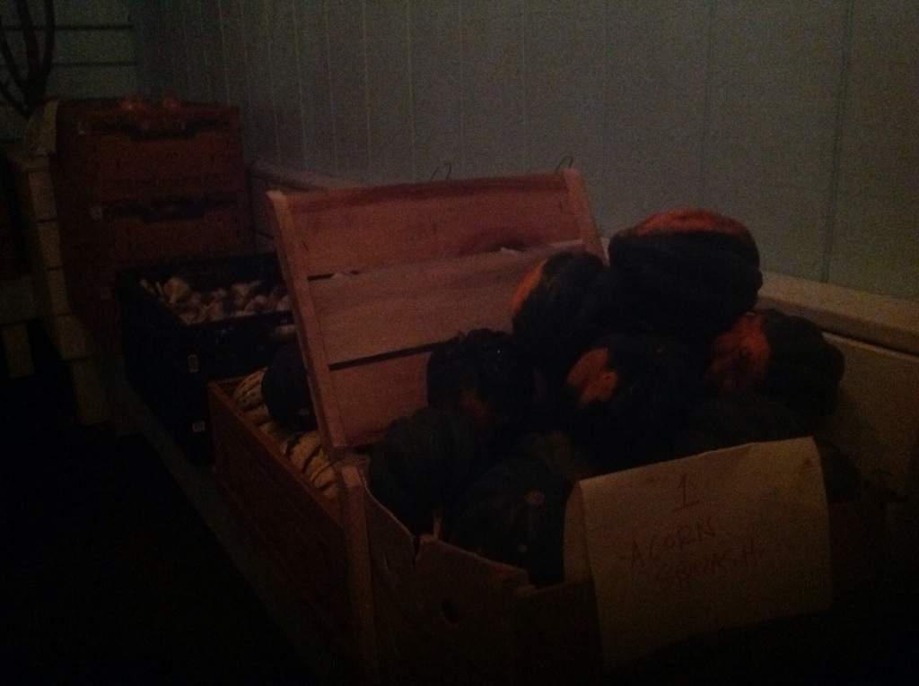 1 bunch Spinach, 1/2 pound Poblano Peppers, 1 Butternut Squash, 1 Acorn Squash, 1 Baby Sugar Pumpkin, 2 pounds Sweet Potatoes, 2 pounds Yellow Onions, 2 pounds Red Onions, 1 & 1/2 pound Red Potatoes, 1 & 1/2 Golden Potatoes, 2 pieces of Garlic