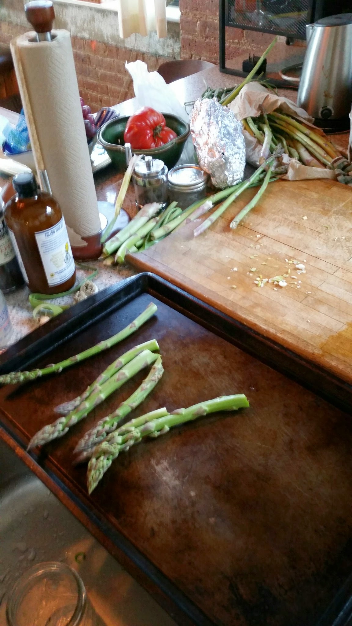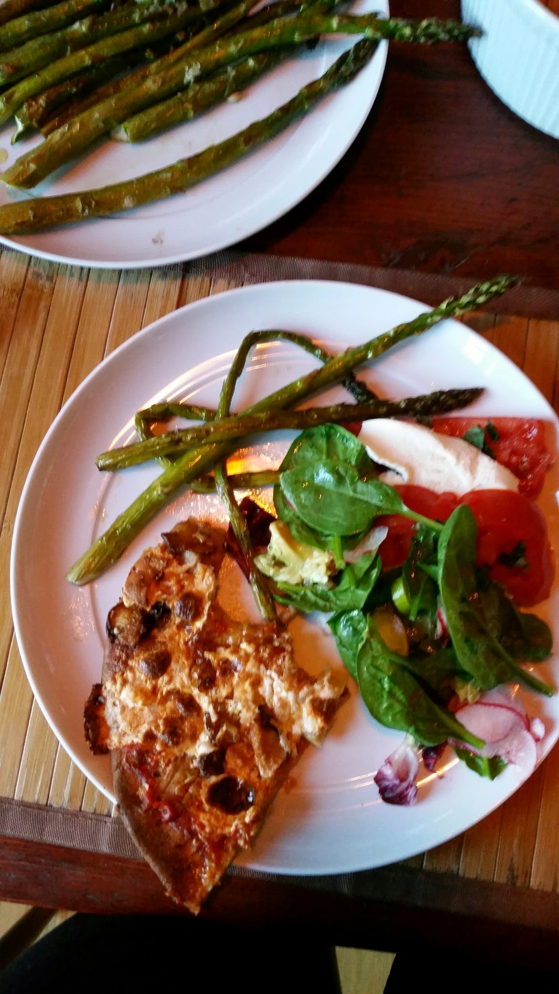 The asparagus went in the oven at 450 degrees for a good long time–maybe 20 minutes. We were baking pizza at the same time and temperature, made with frozen whole wheat dough from Freshdirect. Plus a green salad and also some tomato and mozzarella.
