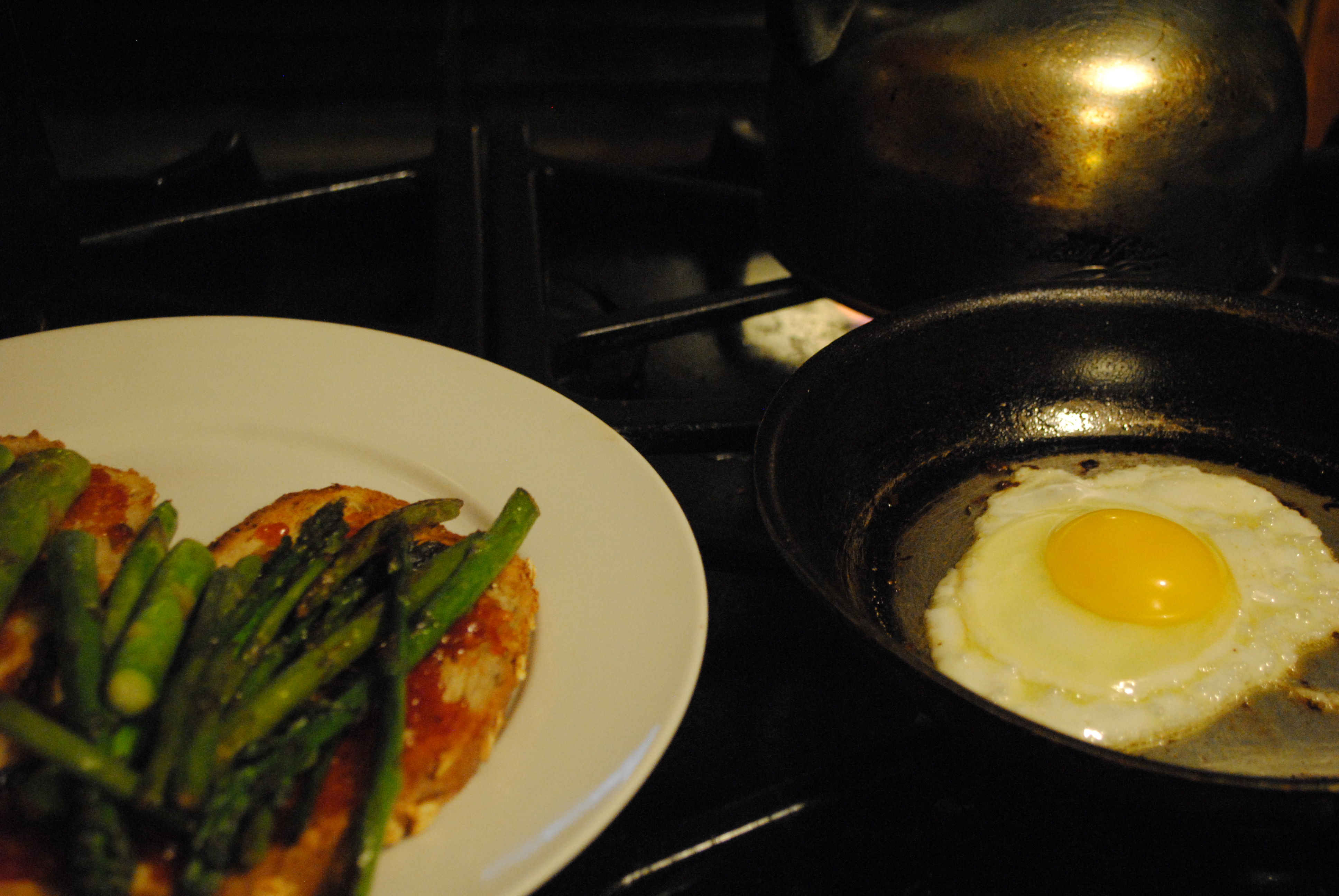 During the month of May, my morning toast typically includes asparagus. In the morning I tend to saute up some asparagus for breakfast and lunch. This week I went with multi-grain toast smothered in a sweet and slighty spicy pepper/tomato jam I made from the Vegetable share last summer. The toast is then layered in sauteed asparagus and a fried egg.